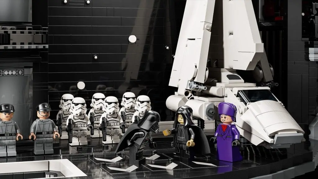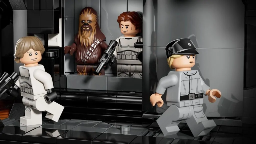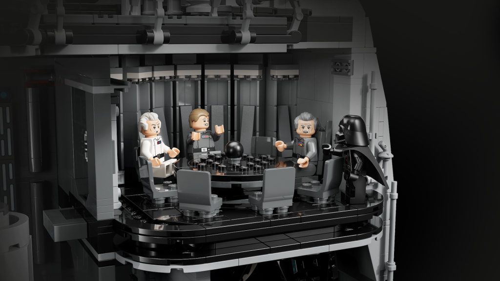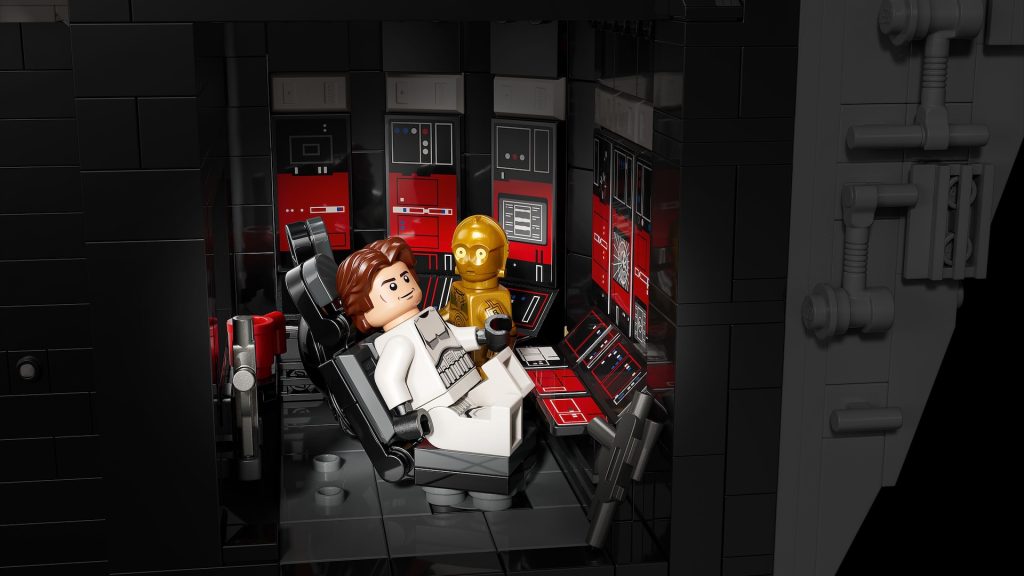 Die offizielle Pressemitteilung nennt eine Handvoll Funktionen in 75419 Todesstern, einschließlich Thronsaal, Hangar, Gefängniszelle und Superlaser, weist aber nur auf eine einzige Funktion der funktionierenden Müllpresse hin. Die Rückseite der Schachtel verrät auch keine weiteren – hoffen wir, dass es zumindest eine Art Mechanismus gibt, der den zentralen Aufzug funktionieren lässt, wie es in 10188 Death Star der Fall war.