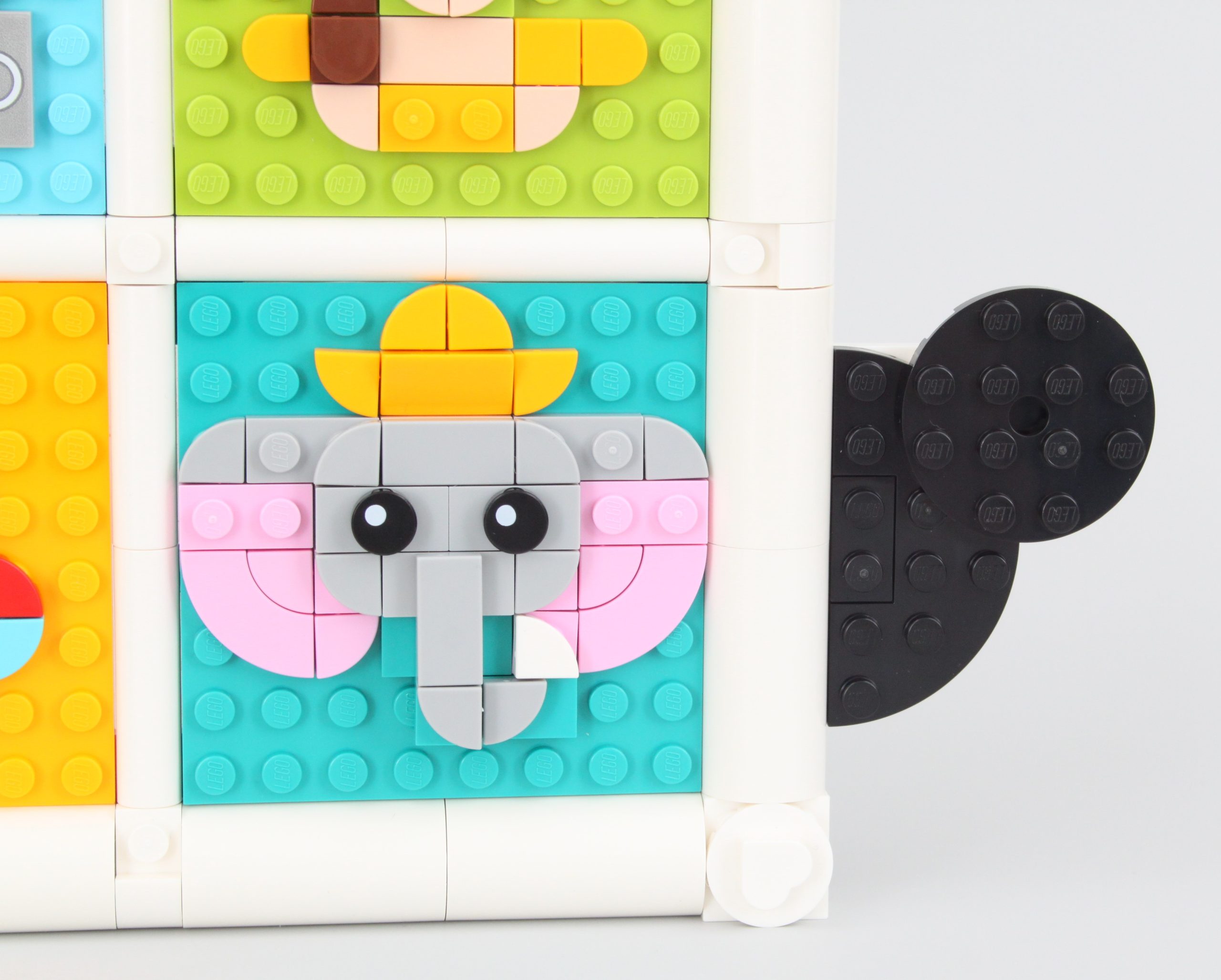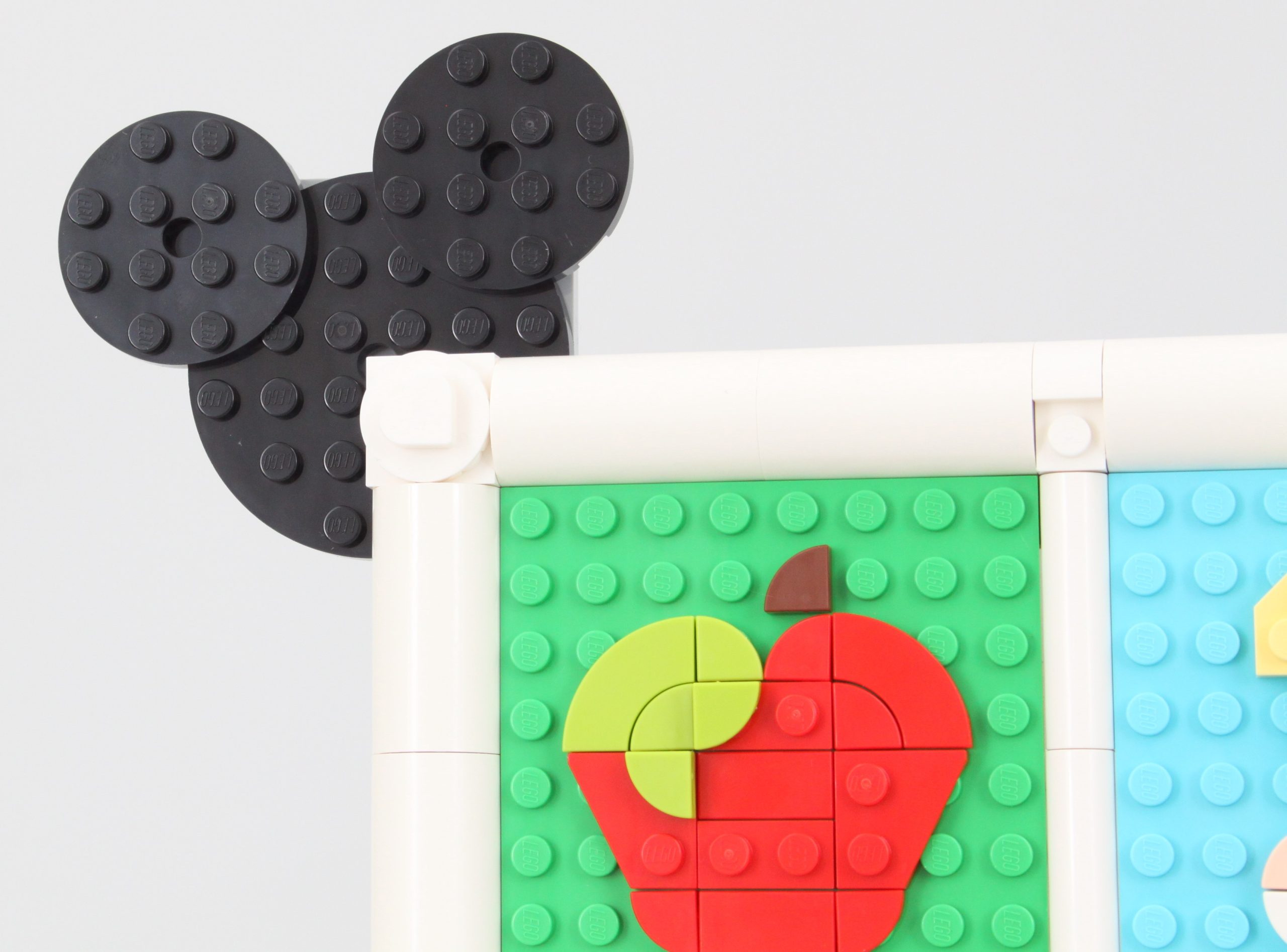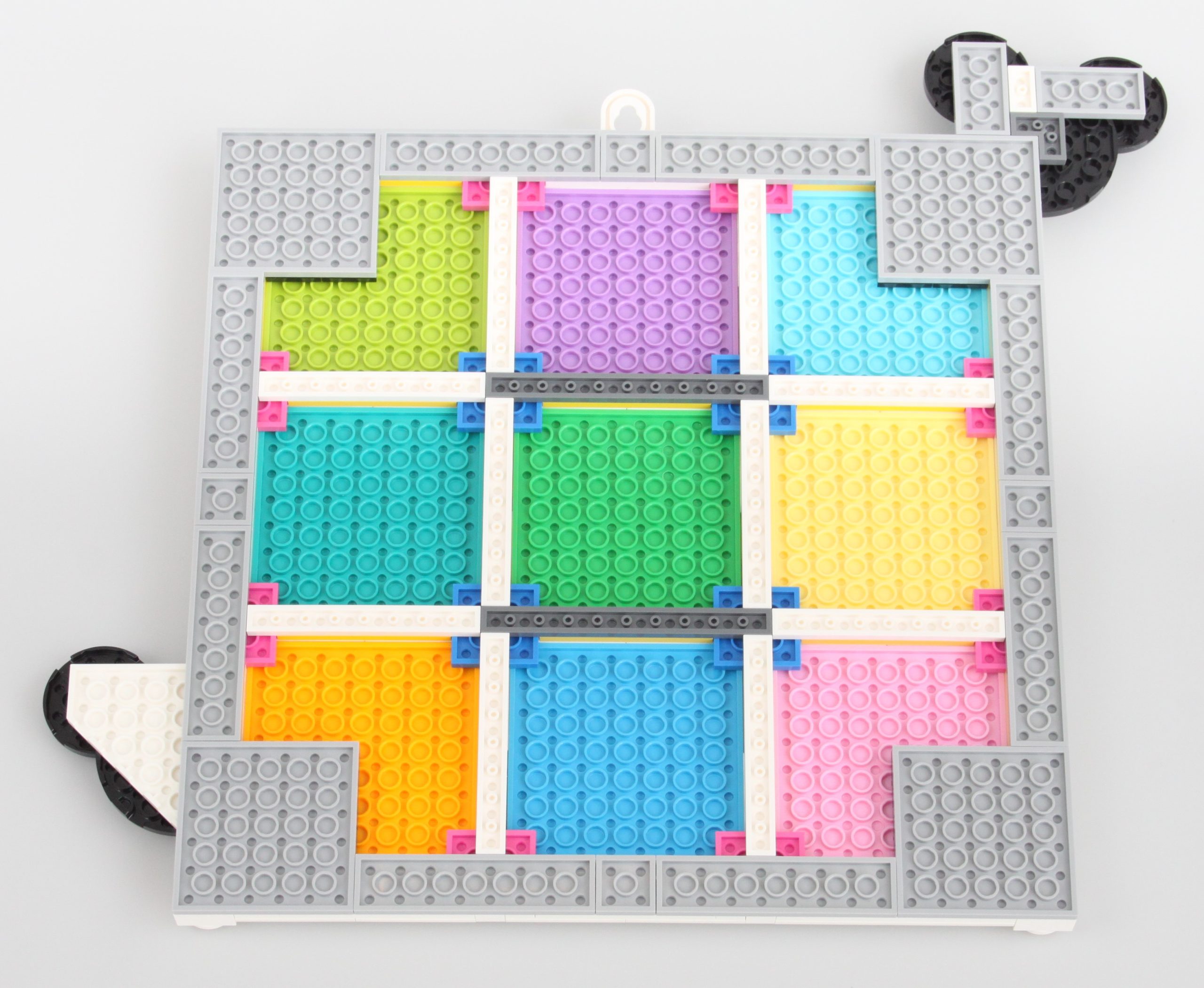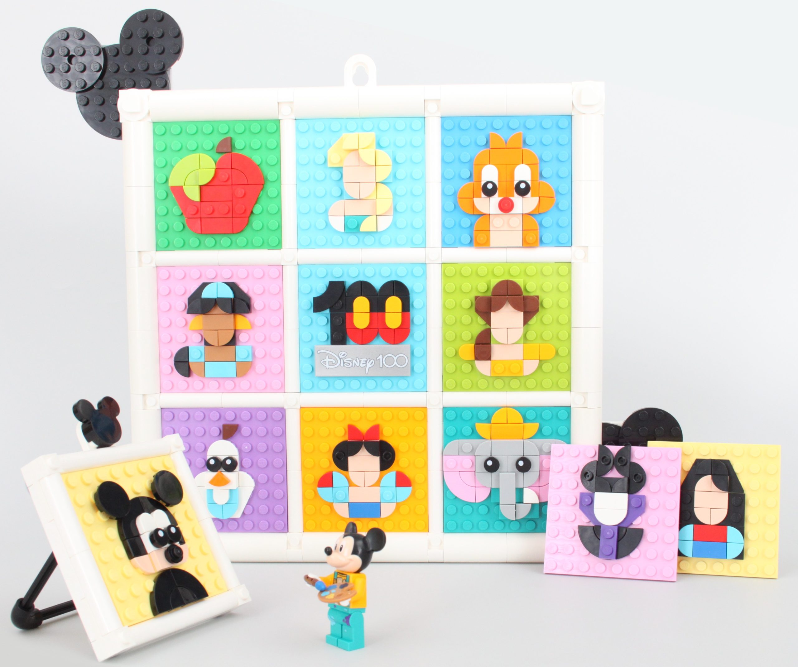 Es ist leicht zu übersehen 43221 100 Jahre Disney Animationssymbole neben Neuerscheinungen wie z.B 43227 Bösewicht-Icons und 43226 Disney Duos, aber dieses Collage-Konzept macht jede Menge Spaß. Der Hauptteil des Aufbaus ist der größere Rahmen mit neun Schlitzen für Mosaike, die jeweils auf einer farbigen Platte montiert sind.