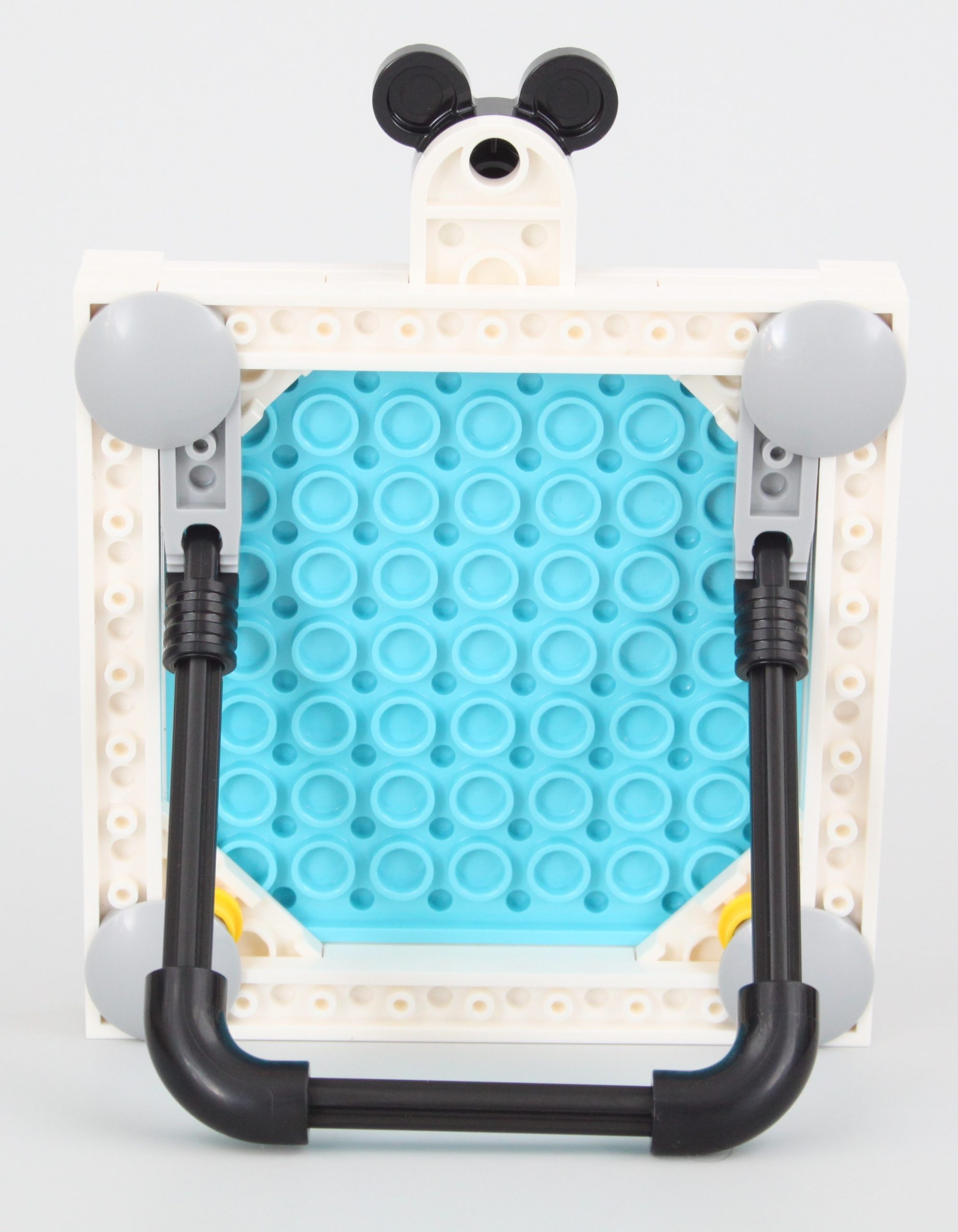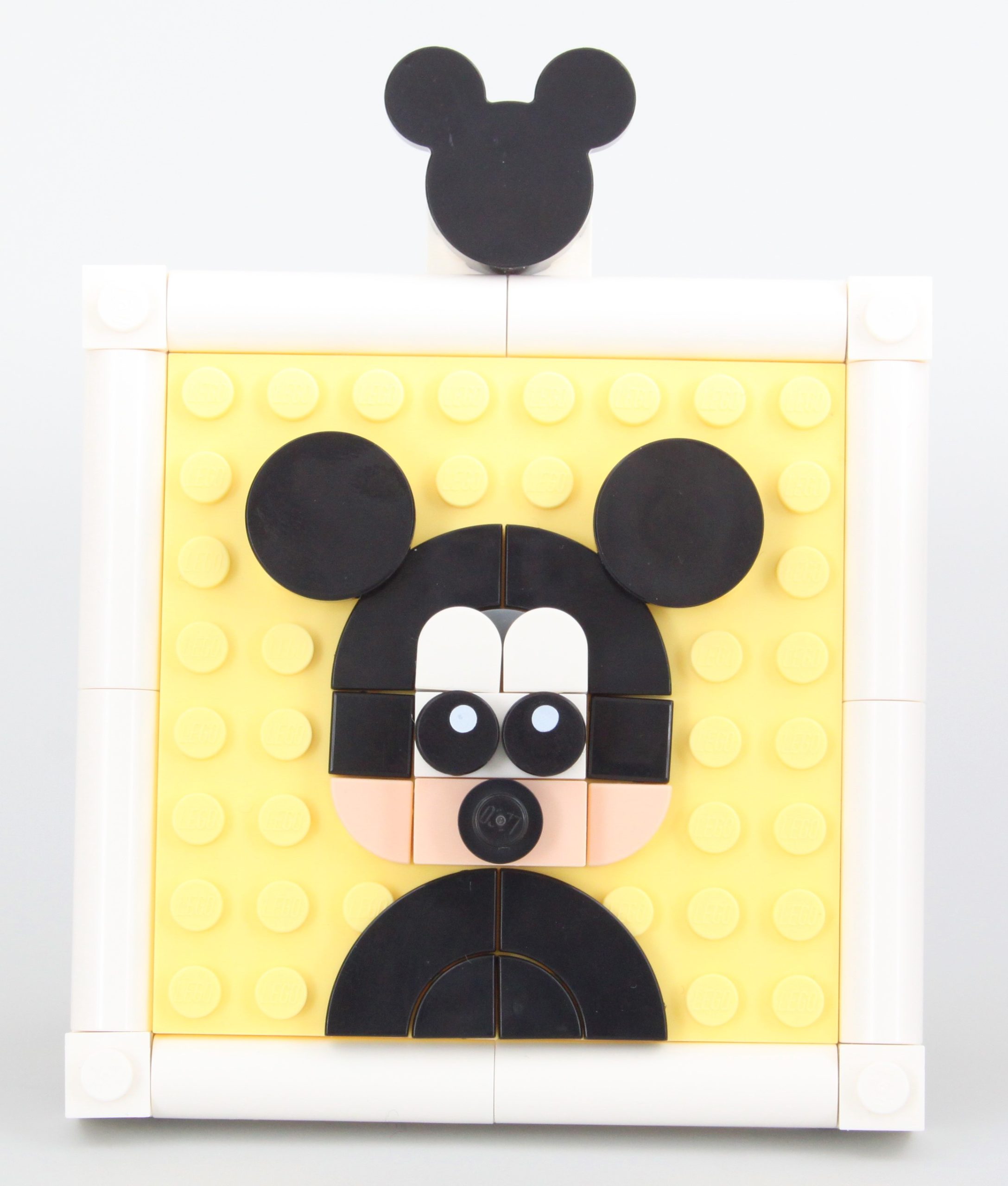 Der Rahmen lässt sich einfach zusammenbauen und integriert einige Mickey-Embleme in das Design. Neben dem größeren Rahmen gibt es jedoch einen kleineren Fotorahmen mit Platz für nur ein Mosaik. Dieser Rahmen kann entweder mit einem Haken an der Wand aufgehängt oder mit dem mitgelieferten Ständer aufgestellt werden, während sein Mickey-Emblem auch den Haken verdeckt – beides Dinge, die der größere Rahmen nicht kann.