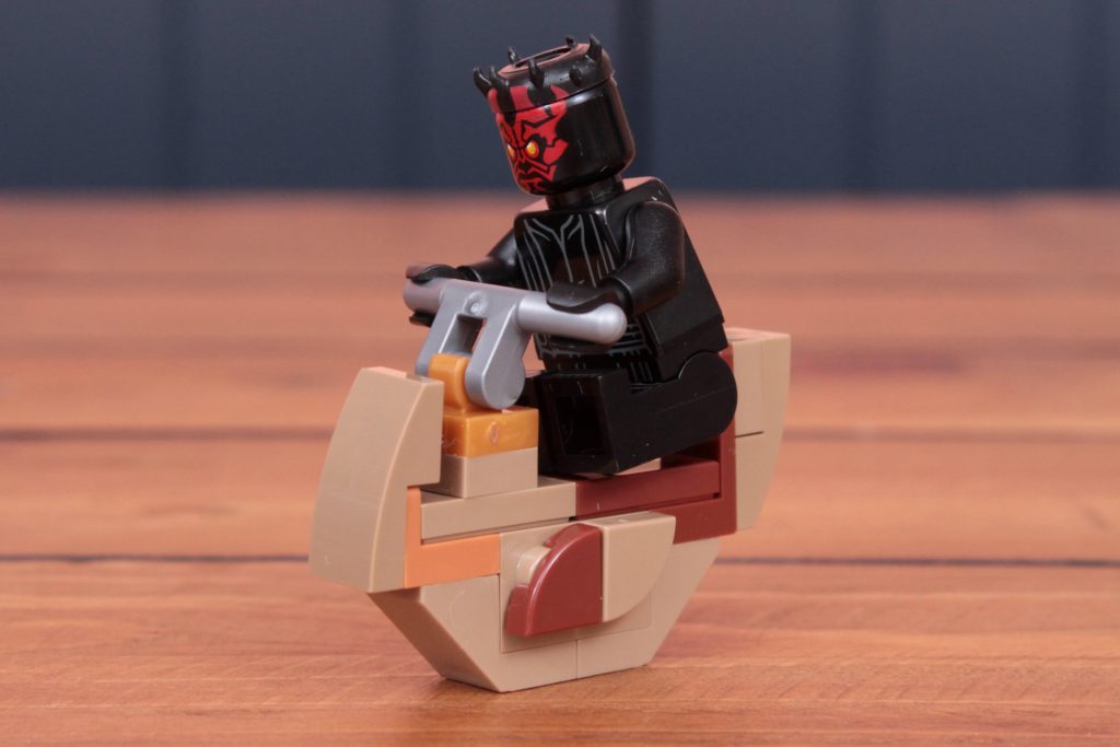 Der Zugang zum sphärischen Cockpit erfolgt über vier verschiedene Klappelemente – die obere Schale, die Seiten und die Rückseite – und ermöglicht Maul die Fahrt auf seinem Bloodfin-Speeder, der hier nur mit einer Handvoll Elementen nachgebildet wurde und für das umfassendere Ethos des Sets steht, bei dem Effizienz über alles geht.