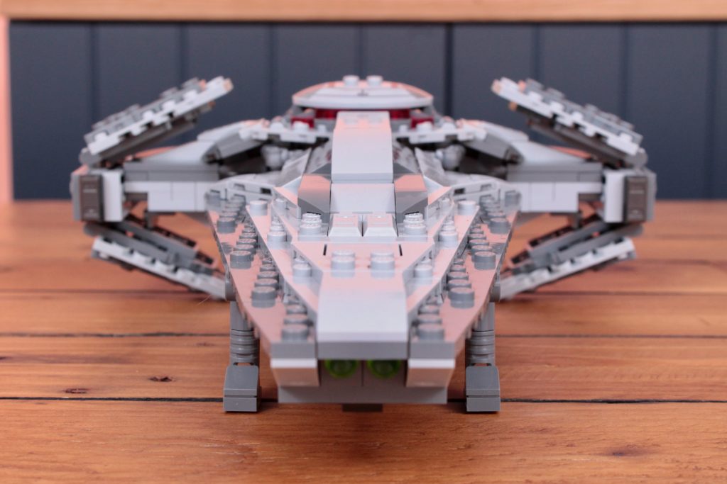 Der Scimitar sieht in seiner jetzigen Form für seine Größe ansonsten recht gut aus und nutzt die seit der letzten Version eingeführten Elemente geschickt, um seine einzigartige Mischung aus spitzen Proportionen und abgerundeten Kanten besser einzufangen. Da man jedoch größtenteils nur in zwei Grautönen Bauen, wirkt selbst dieser relativ kurze Bauprozess nicht unbedingt besonders anregend. Das ist LEGO Star Wars' Kreuz an dieser Stelle zu tragen.