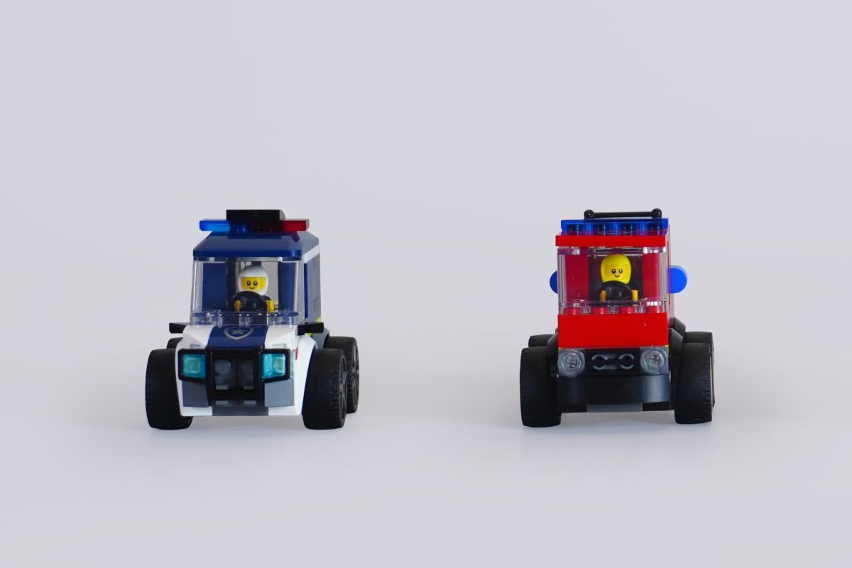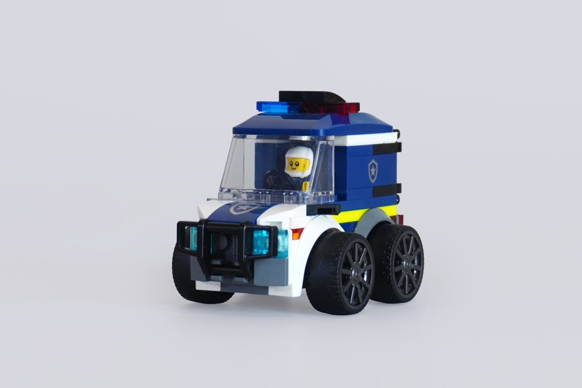 60481 Polizeiwagen Dieses Set ist mit Abstand das kurvenreichste, mit schrägem Dach und Motorhaube (für alle amerikanischen Leser: Hood), aber trotzdem ist es nicht gerade aerodynamisch. Es ist allerdings hoch und hat hinten einen zusätzlichen Verschlussknopf, damit jedes unartige Baby, das verhaftet wird, sicher ins Gefängnis gebracht werden kann.