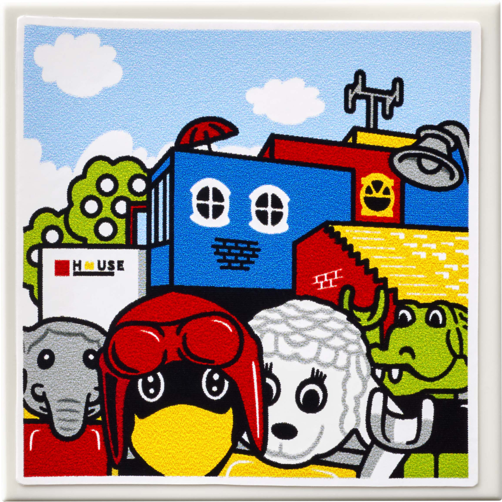 Die Figur von Edward Elephant hält in einer Hand einen Stab, um seine Fabuland-Freunde zu dirigieren, und in der anderen eine beklebte Kachel. Das Bild auf dem letzteren Stück zeigt die vier Charaktere aus dem Set, die vor dem LEGO House, komplett mit Fenstern im Fabuland-Stil.