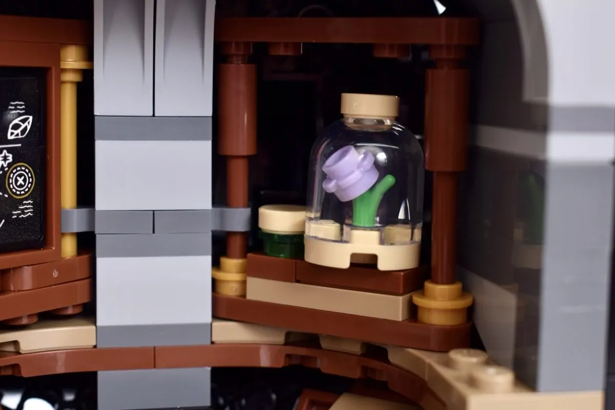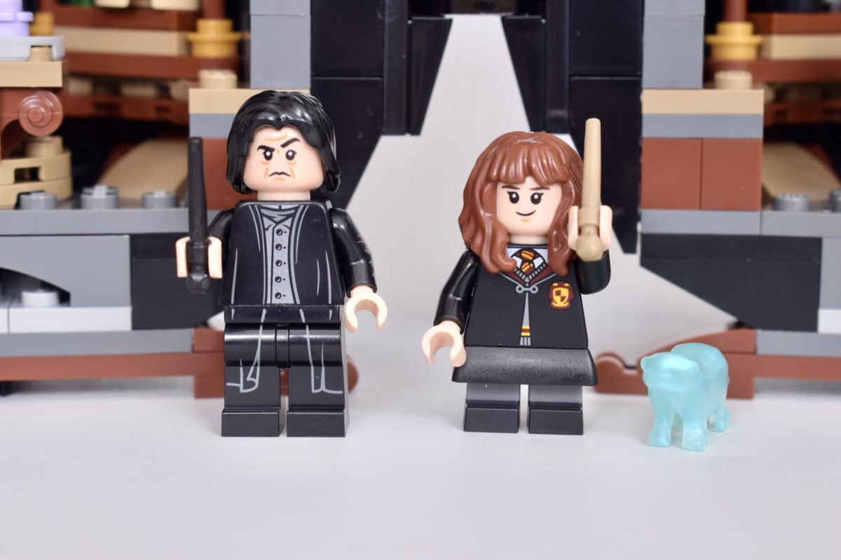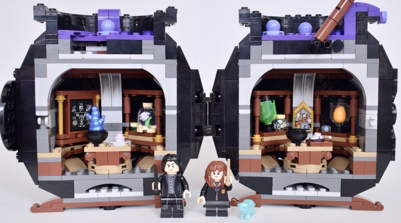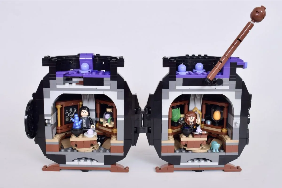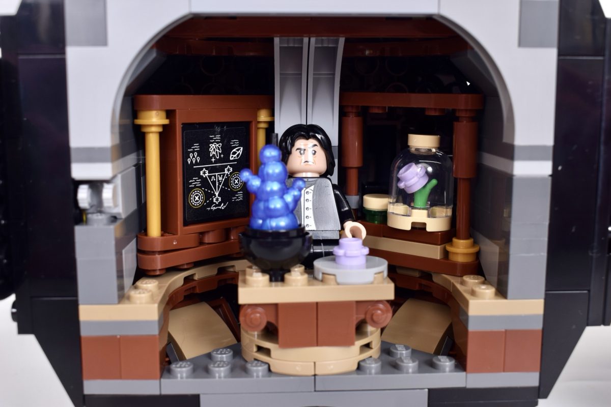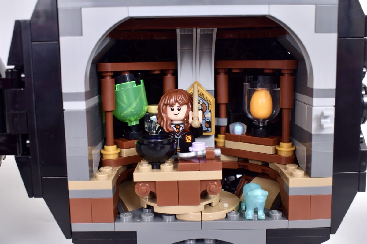 Nach dem Öffnen findet man auf Snapes und Hermines Seite des Klassenzimmers jeweils einige lustige Miniaturversionen verschiedener magischer Zutaten und Kreaturen. Allerdings wirkt der Innenraum eher eng als handlich, und es ist gar nicht so einfach, eine Minifigur hineinzusetzen, ohne versehentlich etwas vom Tisch zu stoßen.