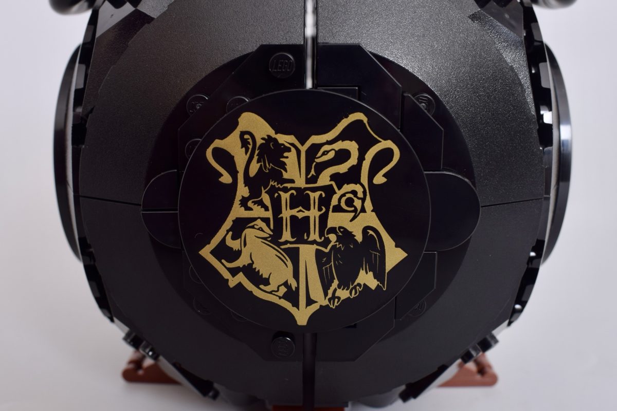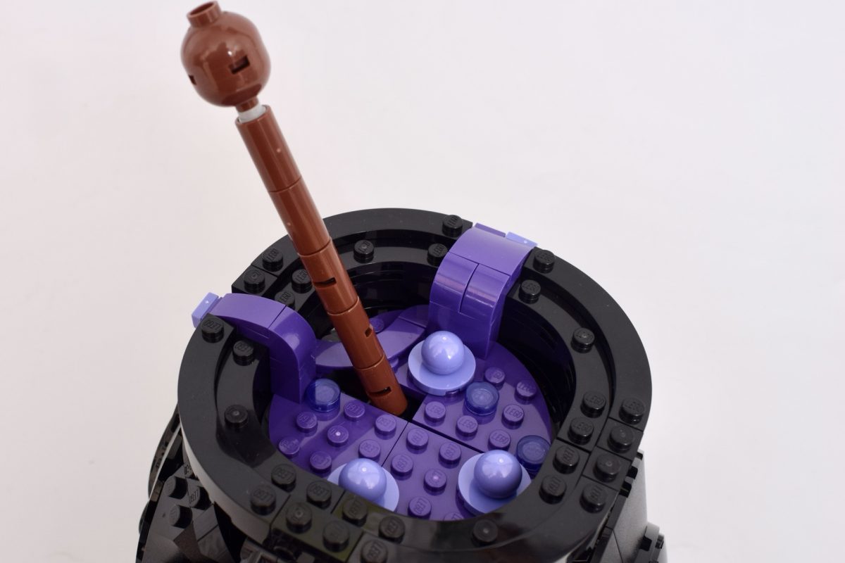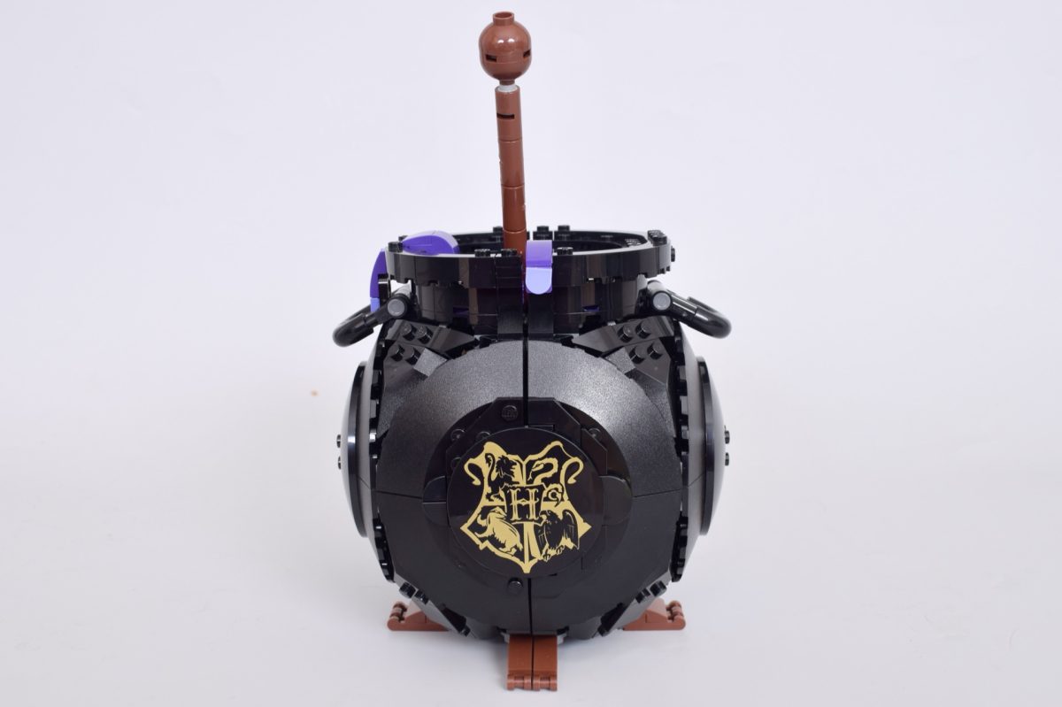 Das Endergebnis ist alles andere als ein perfektioniertes Kesselmodell, obwohl das Tropfen des violetten „Zaubertranks“ im Inneren ein netter Effekt ist. Das aufgedruckte Hogwarts-Wappen hält die Seiten zwar etwas zusammen, aber nicht genug, um alle Spalten zu kaschieren, wie man oben sehen kann. Der Rührstab lässt den Kessel hinein- und herausspringen – ein Effekt, der überzeugender wäre, wenn er tatsächlich fester einrasten würde.