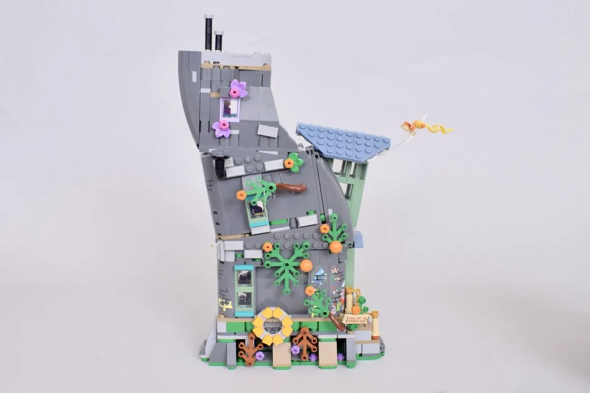 76467 Luna Lovegoods Haus ist in ein passend farbenfrohes Äußeres gehüllt und hebt sich damit deutlich von der großen Mehrheit der Minifiguren ab. LEGO Harry Potter Sets, die sich typischerweise auf Schloss Hogwarts konzentrieren. Während die Grundfarbe Dunkelgrau ist, sind verschiedene Teile des Hauses und des Daches in Sandgrün und Sandblau gehalten und mit magischen Pflanzen und Aufklebern verziert, um die Leidenschaft der Lovegoods für alles Skurrile und Wunderbare widerzuspiegeln.