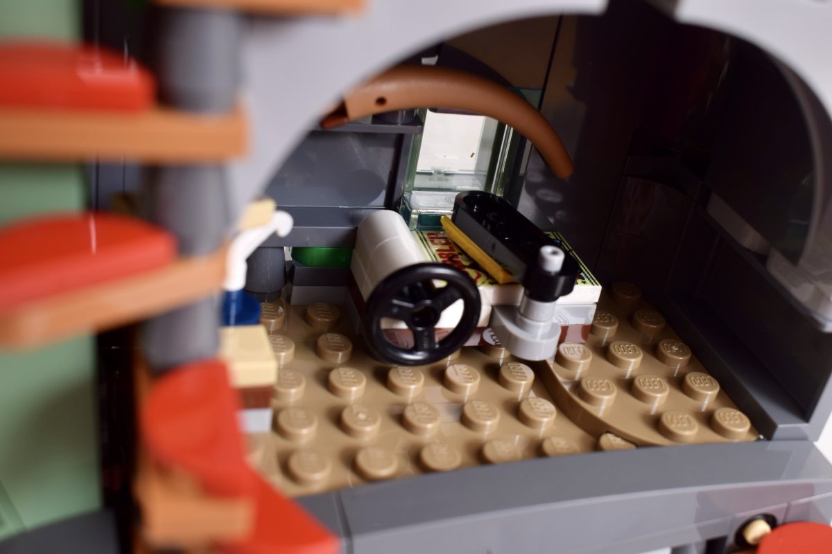 Die Rückseite des Modells ist offen, um einen (zugegebenermaßen beengten) Zugang zum Inneren zu ermöglichen. Die Böden sind nicht nur von außen schief, sondern der mittlere Boden ist sogar zur Seite geneigt, was zwar ein einzigartiges Aussehen erzeugt, den Zugang zum Inneren des Modells aber zusätzlich erschwert.