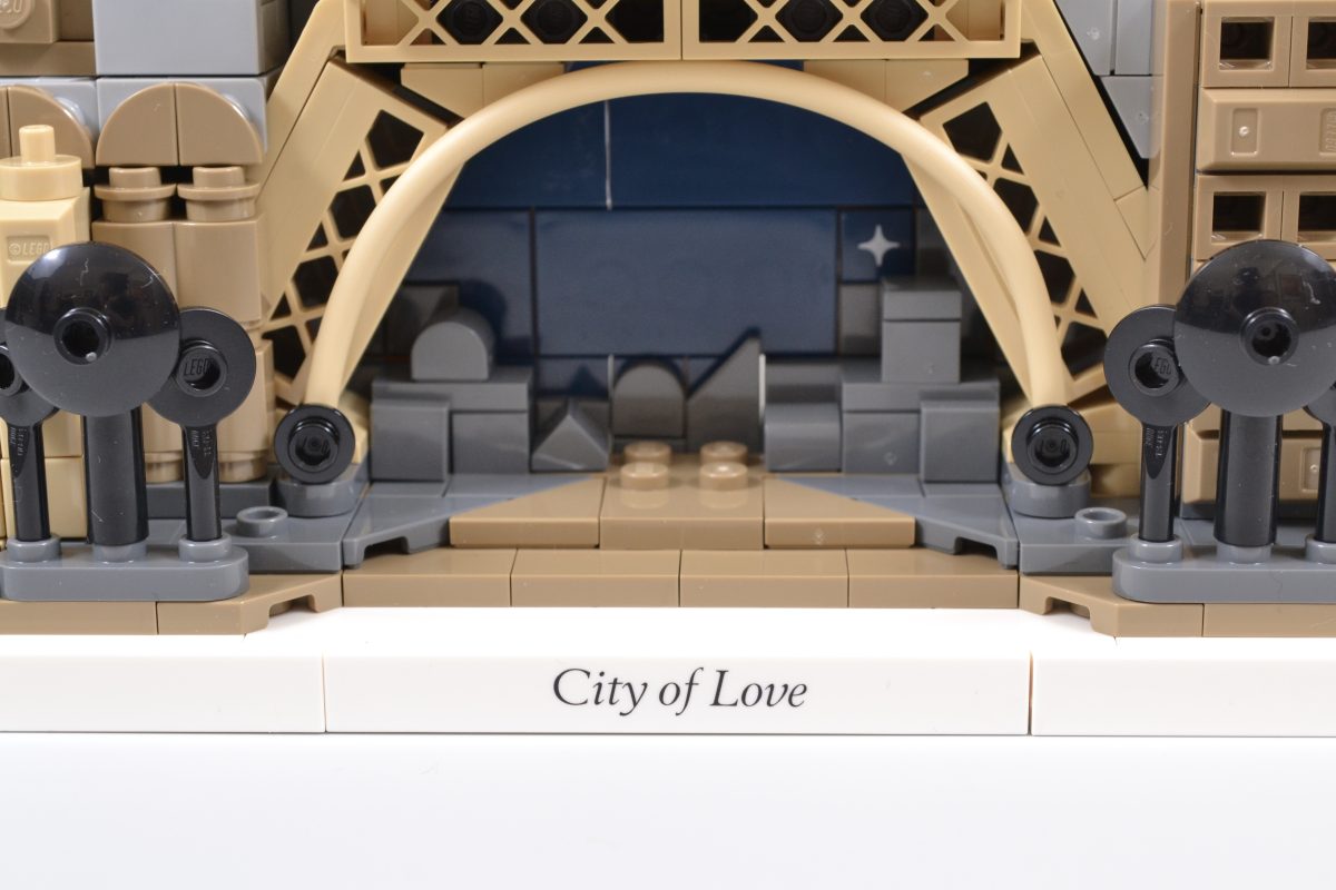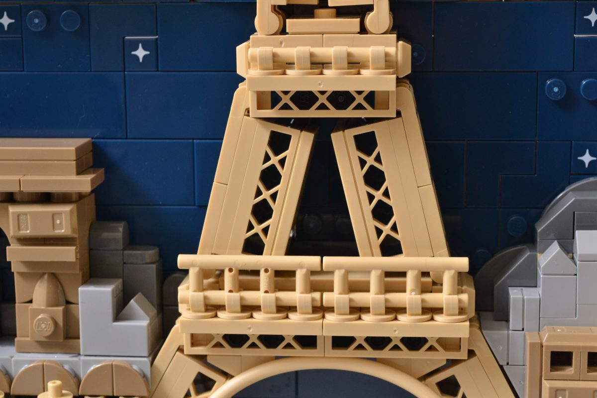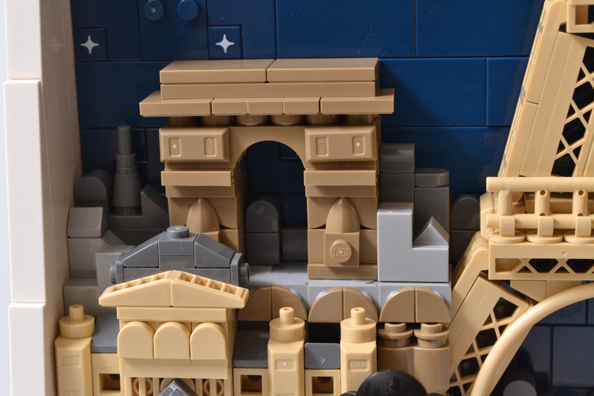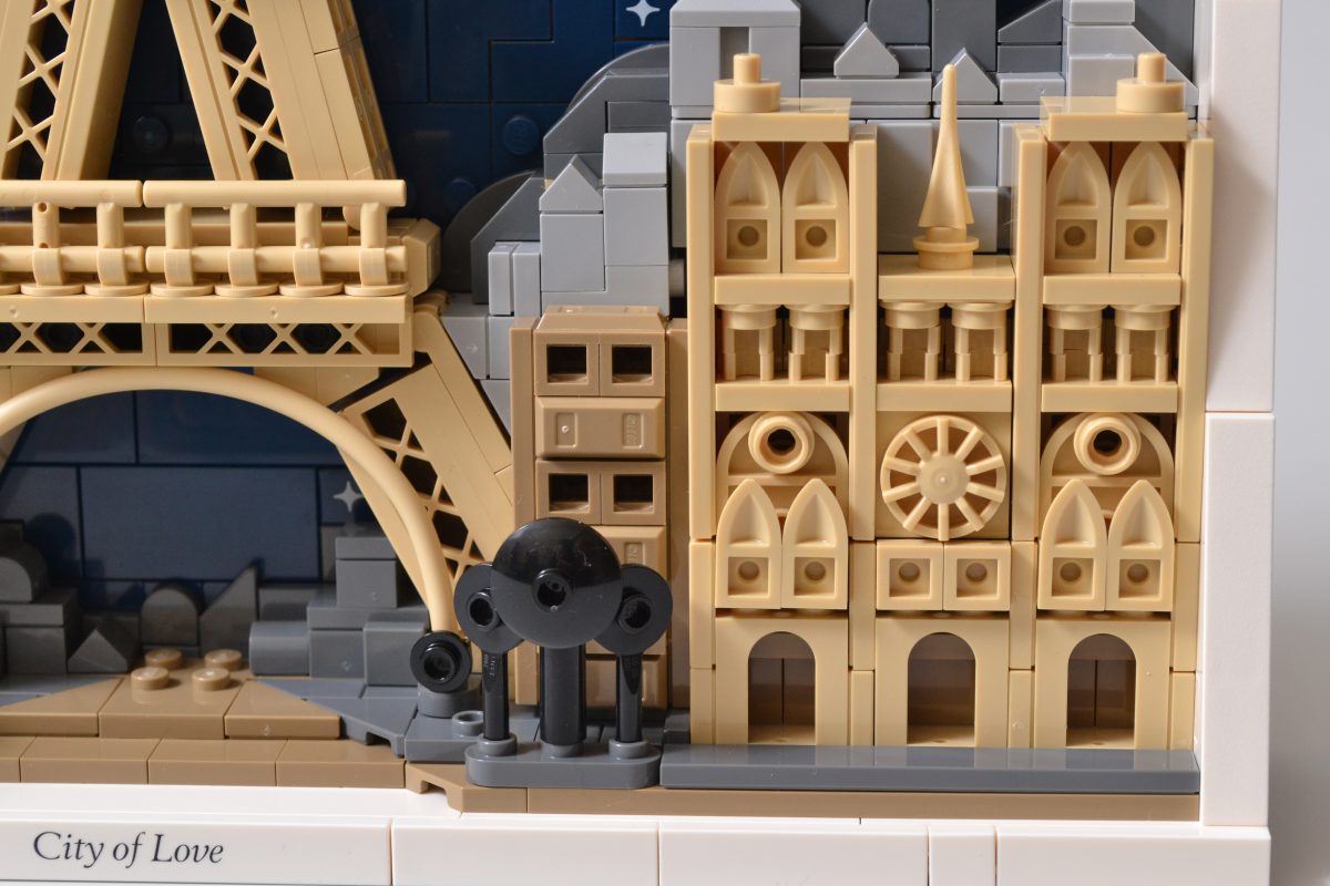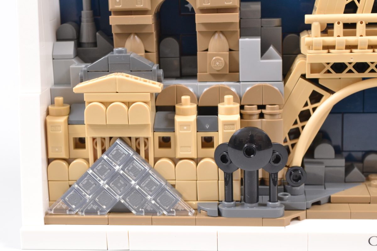 Zum Beispiel werden hellbraune Zaunelemente verwendet, um das Eisengitterwerk des Eiffelturms darzustellen, dunkelbraune Barrenstücke (zum ersten Mal in dieser Farbe) fangen einige der skulpturalen Friesdetails des Arc de Triomphe ein, die Rückseite von 1×1-Steinen sind perfekte Mikrofenster, spitzbogige gotische Bögen werden mit der Unterseite von Zahnplatten erzielt, das Rosettenfenster der Kathedrale Notre-Dame de Paris wird durch ein speichenförmiges Radkappenelement dargestellt und die Spitze des Eiffelturms wird aus dem Fechtschwert einer Minifigur gefertigt.