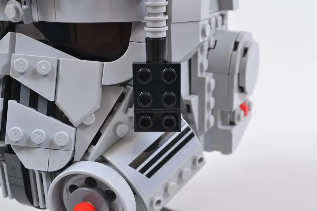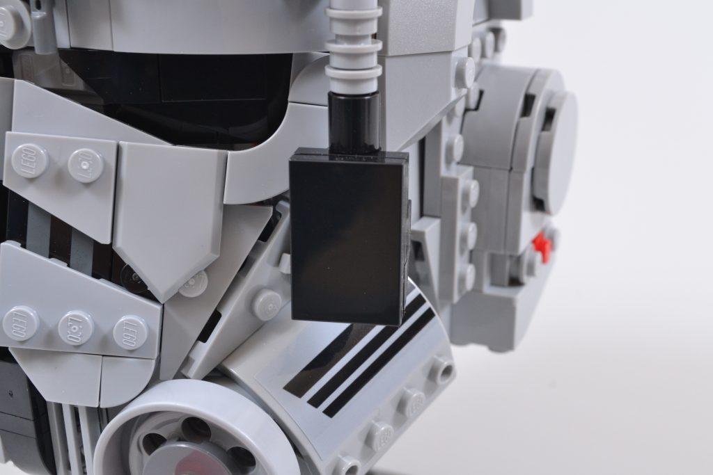 Dann gibt es noch den freiliegenden Blick auf zwei der Greeblie-Abschnitte an der Vorderseite des Helms, ein leicht unfertiges Gefühl, das leicht mit ein paar schwarzen 3×2-Kacheln behoben werden kann (siehe Bilder oben), etwas, das das LEGO Star Wars Das Designteam hätte wirklich etwas in das Set aufnehmen können. Die Nieten sollen vermutlich die leichte Textur des tatsächlichen Helms darstellen, fallen aber am Ende etwas zu sehr auf.