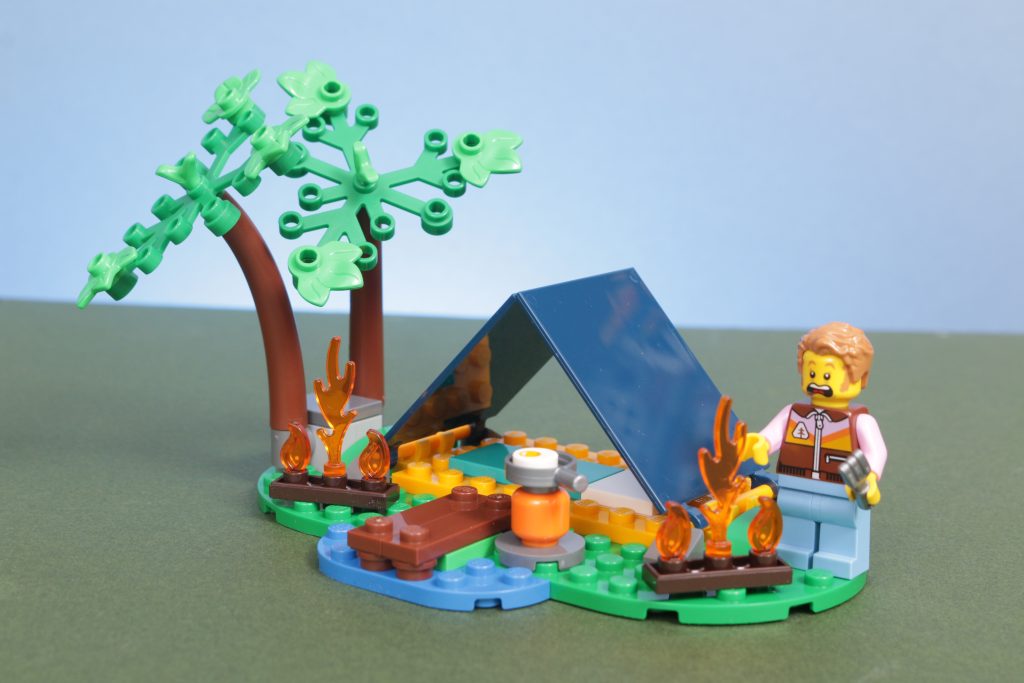 60412 4×4 Feuerwehrauto mit Rettungsboot Hier wird es interessant, wenn auch etwas komisch. Ein unglücklicher Camper hat sein Ei angezündet, und es hat sich über seinen Campingplatz am Flussufer verteilt. Trotz der Nähe zum Wasser ist die Feuerwehr sofort zur Stelle, um einen Geländewagen und ein Schlauchboot zu schicken. Das erschrockene Gesicht des Campers könnte auf die aggressive Reaktion von LEGO hindeuten. Cityist der Mutigste.