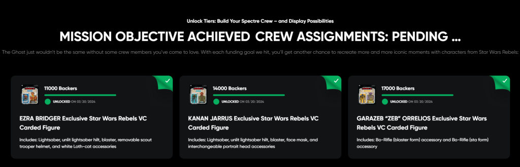 Zu den jüngsten Beispielen – und Erfolgen – dieser Initiative gehören eine Nachbildung von The Ghost aus Star Wars: Rebels. Bei diesem Projekt konnte das Schiff mit einem detailreichen Innenraum finanziert werden. Mit genügend Unterstützern konnten zusätzliche Figuren hinzugefügt werden. Jedes zusätzliche Ziel für The Ghost wurde erreicht. Die Mos Eisley Cantina wird derzeit finanziert, wobei nur noch ein Ziel von 17,000 Unterstützern fehlt. Sie kostet aktuell 14,737 Stück und 399.99 US-Dollar – vergleichbar mit dem LEGO Star Wars UCS-Sets.
