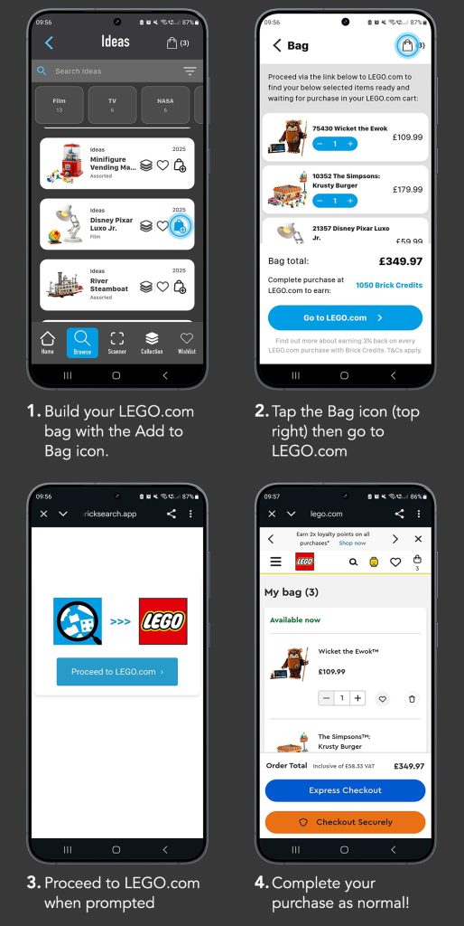 Brick Search Plus-Mitglieder können ihre LEGO.com Einkaufstasche in der App, dann wie gewohnt zur Kasse gehen bei LEGO.com. Es ist nicht nur schneller, eine Einkaufstasche zusammenzustellen – machbar mit einem einzigen Fingertipp auf jedes aktuell verfügbare Set –, sondern Brick Search Plus-Mitglieder können auch 3 % ihrer Ausgaben in Form von Brick Credits zurückerhalten.