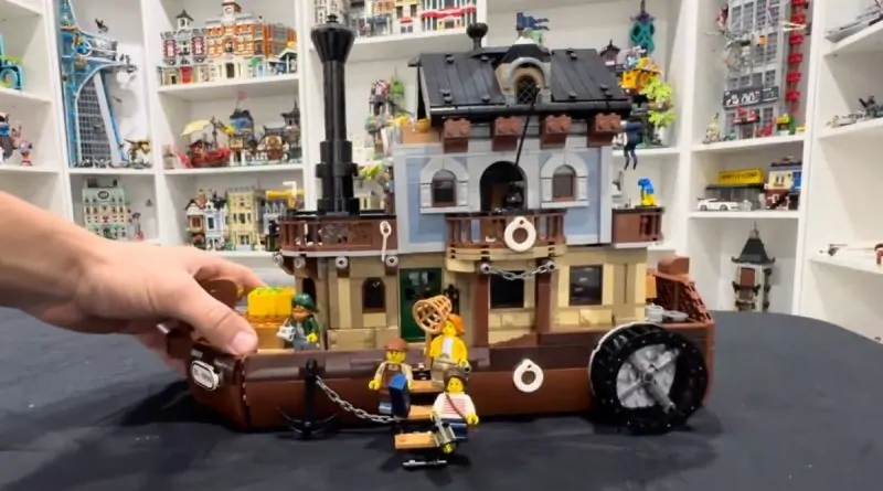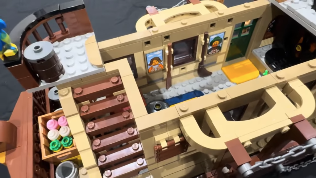 Es gibt eine Handvoll Aufkleber, die auf lustige Weise verwendet werden, wie zum Beispiel große Porträtgemälde von einigen der vier Minifiguren, und das ganze Boot kann dank der in die Basis eingeBauenen Reifen auch auf jeder ebenen Fläche rollen. Und wenn es das tut, drehen sich die Schaufelräder auf beiden Seiten des Bootes tatsächlich – während der Mechanismus sogar irgendwie das Geräusch eines dahintuckernden Schaufelradboots nachahmt.