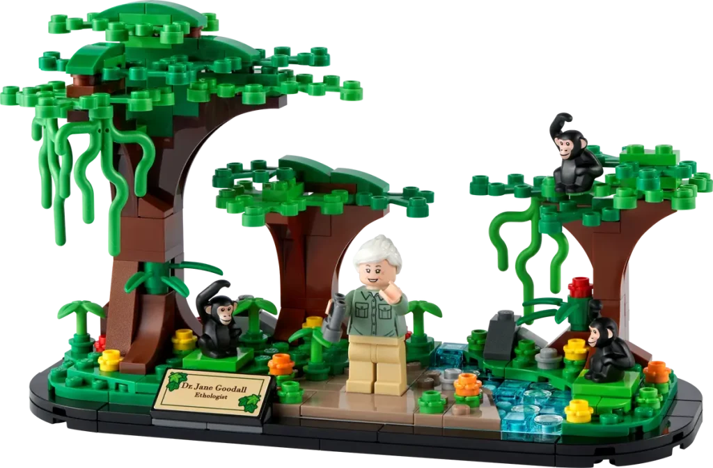 Das Jane Goodall Tribute Set 40530 aus dem Jahr 2022 würdigt die berühmte Figur mit einem Abschnitt eines üppigen Dschungels, durch den die berühmte Ethologin, umgeben von drei Schimpansen, wandert. Der Fokus auf die Natur macht es zu einem einzigartigen Beitrag in der Reihe der Tribute-Sets.