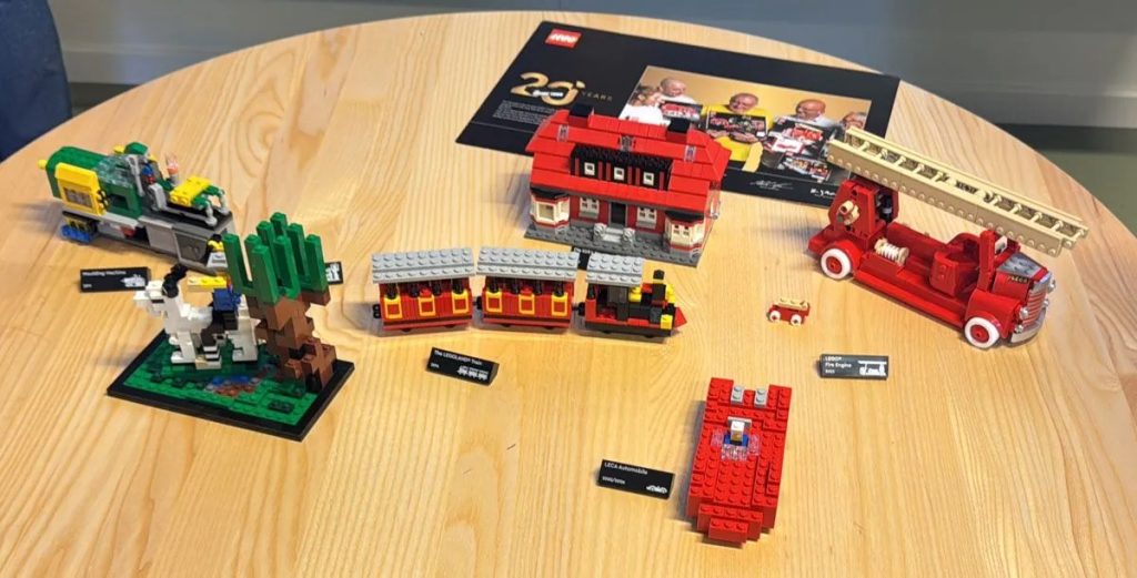 Zu den in Miniaturform in der 4000046 LEGO Inside Tour Anniversary Collection enthaltenen Bauenen gehören das LECA-Automobil von 2025 – das erste exklusive Set von LEGO Inside Tour –, Ole Kirks Haus von 2009, die Formmaschine (2011) von 4000001, der LEGOLAND-Zug (2014) von 4000014, H. C. Andersens Tollpatsch-Hans (2015) von 4000020 und das LEGO-Feuerwehrauto (2023) von 4000040.