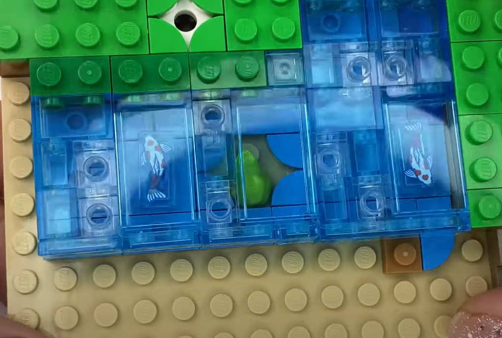 41757 Botanischer Garten hat die Koi-Karpfen-Fliese unter dem gemauerten Wasser, wodurch es für ein realistischeres Aussehen leicht verdeckt wird. Jedoch, 10315 Ruhiger Garten platziert es auf der Oberfläche, sodass es leichter zu erkennen ist. Der LEGO Icons Das Modell enthält außerdem sechs Koi-Karpfenplättchen, drei schwimmend links und drei schwimmend rechts, während die LEGO Friends Beim Bau gibt es nur zwei Koi-Karpfen, die rechts schwimmen.