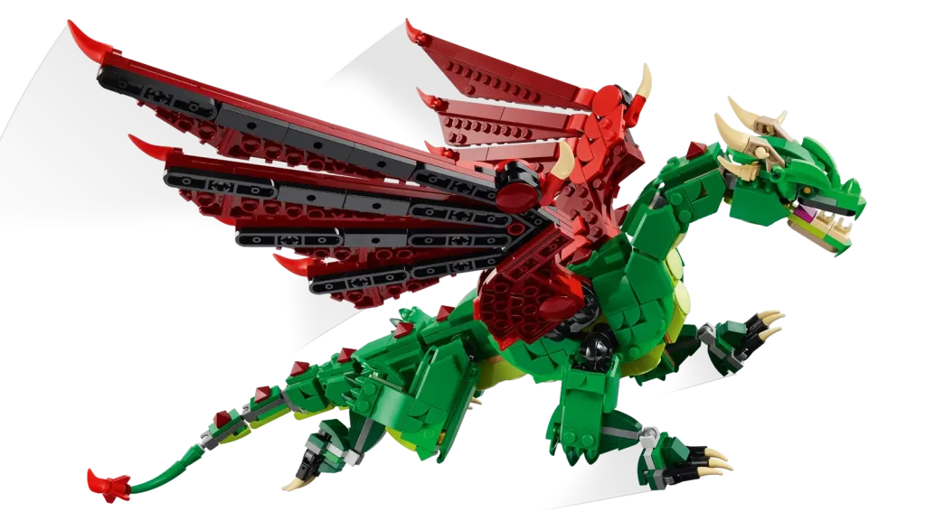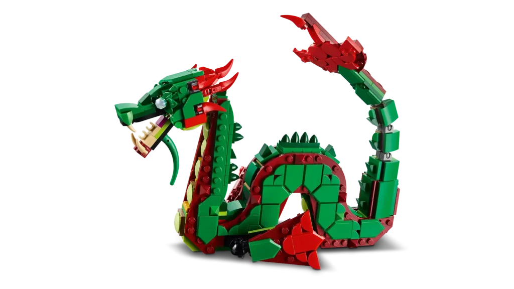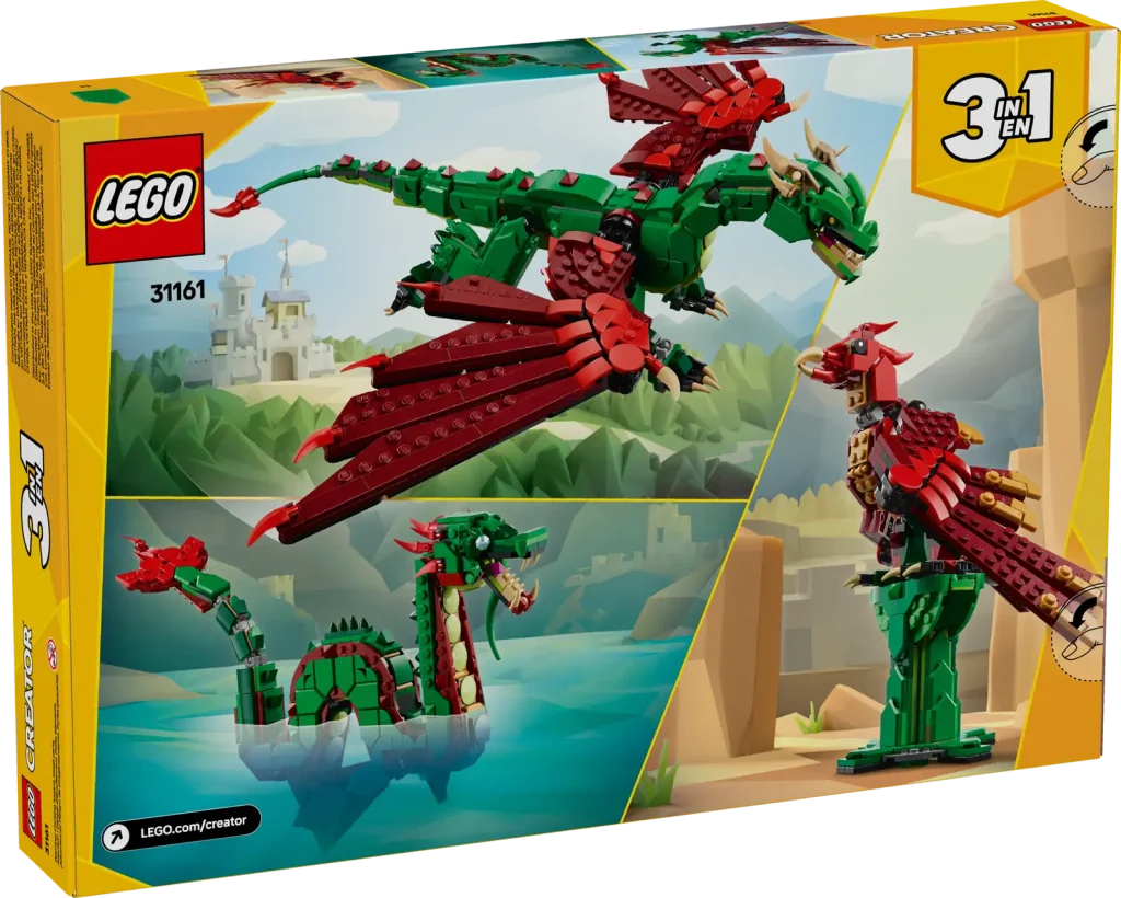 Reise in eine Welt der Fantasie mit 31161 Mittelalterlicher Drache, der sich von einem Drachen in ein Seeungeheuer und dann in einen Phönix verwandeln kann. Die Farbgebung in Rot und Gold ist in jedem Set gut ausgewogen, wobei Rot beim Phönix und Grün beim Drachen dominiert. Sie können vorbestellen 31161 Mittelalterlicher Drache vor seiner Veröffentlichung nächsten Monat.