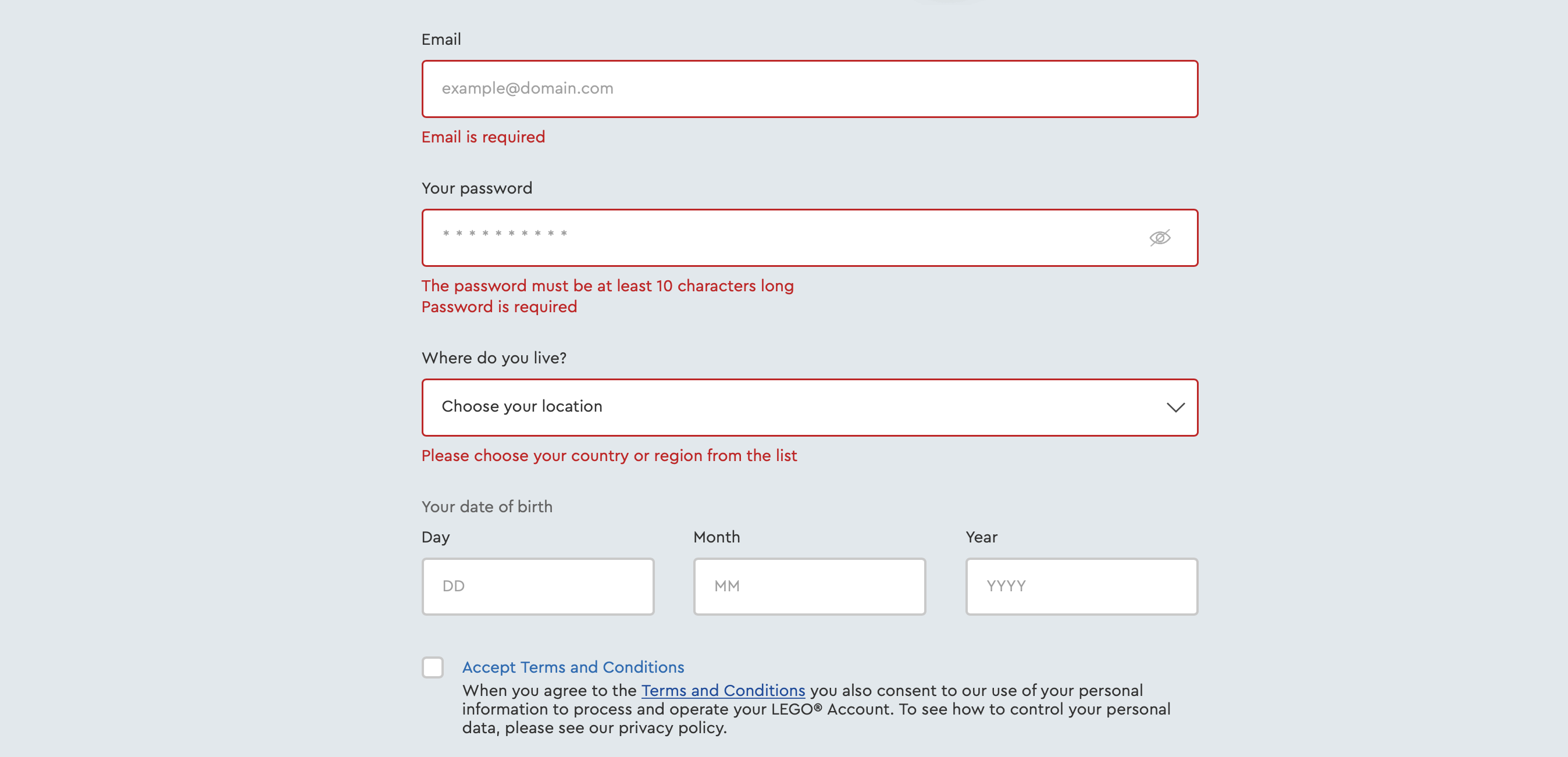 Wenn Sie bereits ein LEGO-Konto haben, können Sie sich damit anmelden. VIP Rewards Center und erstelle dein VIP-Konto. Falls nicht, musst du zuerst ein LEGO-Konto einrichten. Gehe zum nächsten Bildschirm, gib deine E-Mail-Adresse ein, erstelle ein Passwort, wähle deinen Standort und gib dein Geburtsdatum ein. Akzeptiere die Allgemeinen Geschäftsbedingungen (lies sie dir gerne im Detail durch) und klicke auf „Weiter“.