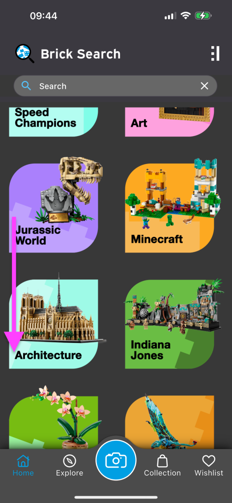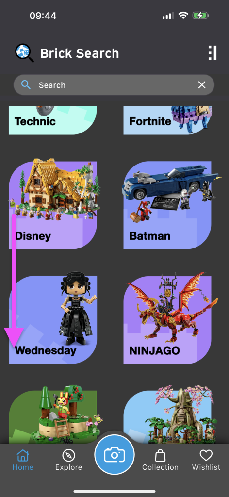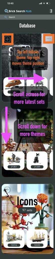 Um einen Eindruck davon zu bekommen, wie das aussehen könnte, wurden bei der Entwicklung der Datenbankseite bisher drei verschiedene Design- und Funktionsvarianten untersucht. Die erste besteht darin, die aktuelle Startseite der App – im Grunde nur eine scrollbare Liste aller aktuell aktiven LEGO-Themen – in eine Datenbankseite umzuwandeln. Dieses Layout ist der bestehenden Nutzerbasis am vertrautesten und bietet eine übersichtliche Themenliste, die Sie auswählen und durchsuchen können. Die Ergebnisse werden nach den neuesten Ergänzungen sortiert.