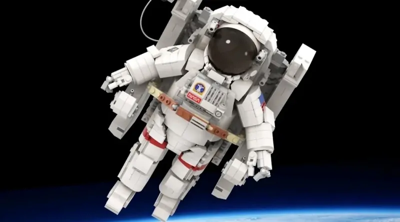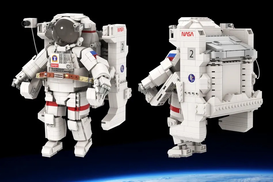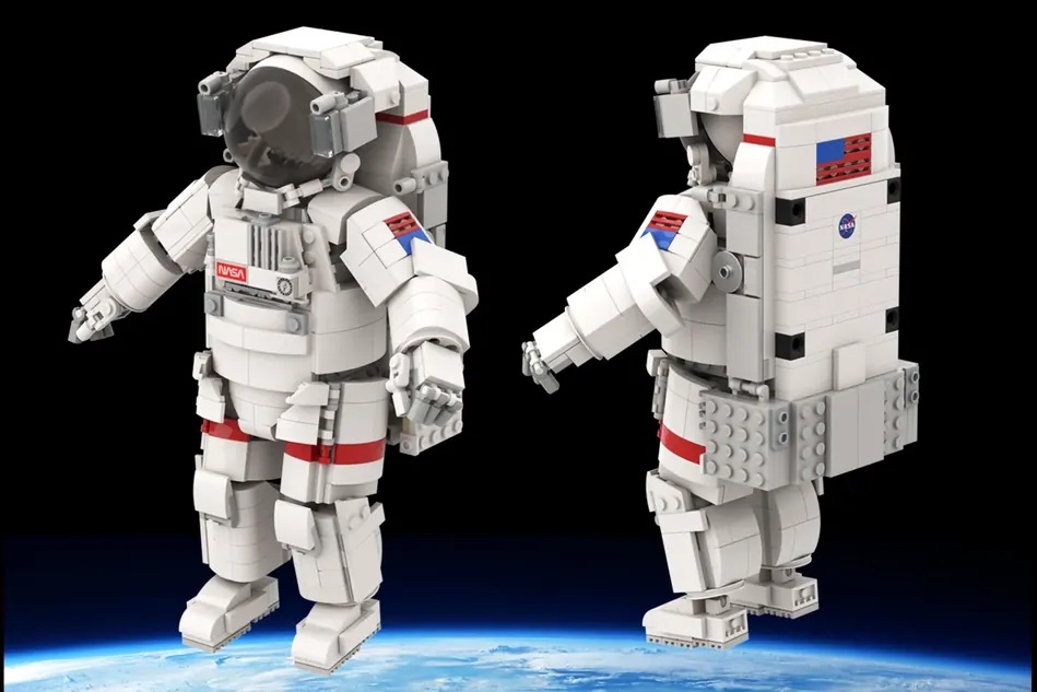 Das aus 927 Teilen bestehende Design zeigt einen beweglichen Astronauten, der auf dem Design des NASA-Raumanzugs Extravehicular Mobility Unit (EMU) basiert, der üblicherweise in der Internationalen Raumstation verwendet wird. Er wurde auch von Bruce McCandless II getragen, der den ersten ungesicherten Weltraumspaziergang der Geschichte durchführte, ein Bild, das in den Aufnahmen des Baus nachgestellt wird.