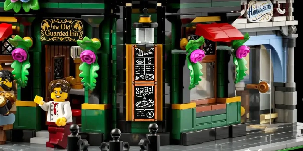 Unverhüllt früher heute, 10350 Tudor-Ecke kanalisiert verschiedene britische Tropen in einem einzigen Set und feiert die Insel Architektur aus allen Jahrhunderten – zusammen mit einer Handvoll typischer Einrichtungen, die man in jeder guten englischen Stadt findet oder StadtGanz oben auf dieser Liste steht The Old Guarded Inn, der Name des traditionellen Gasthauses am Set, das eine Bar, eine Küche sowie Sitzplätze drinnen und draußen umfasst.