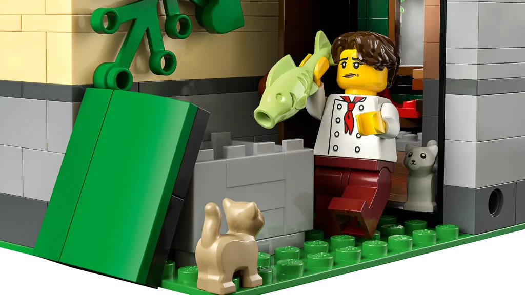 Ein physisches Fischstück – in einer appetitanregenden verrotteten grünen Farbe – kann rund um die Rückseite des Gebäudes im Müllcontainer gefunden werden, und der Bereich um ihn herum bietet viel Platz, um eine der beiden Katzen des Sets zu platzieren. Der LEGO Bei modularen Gebäuden steht das Geschichtenerzählen schon seit 10243 Pariser Restaurant im Vordergrund (aber in noch stärkerem Maße bei 10246 Detektivbüro), also ist es keine Überraschung, dass François diese Gelegenheit hier erneut nutzt.