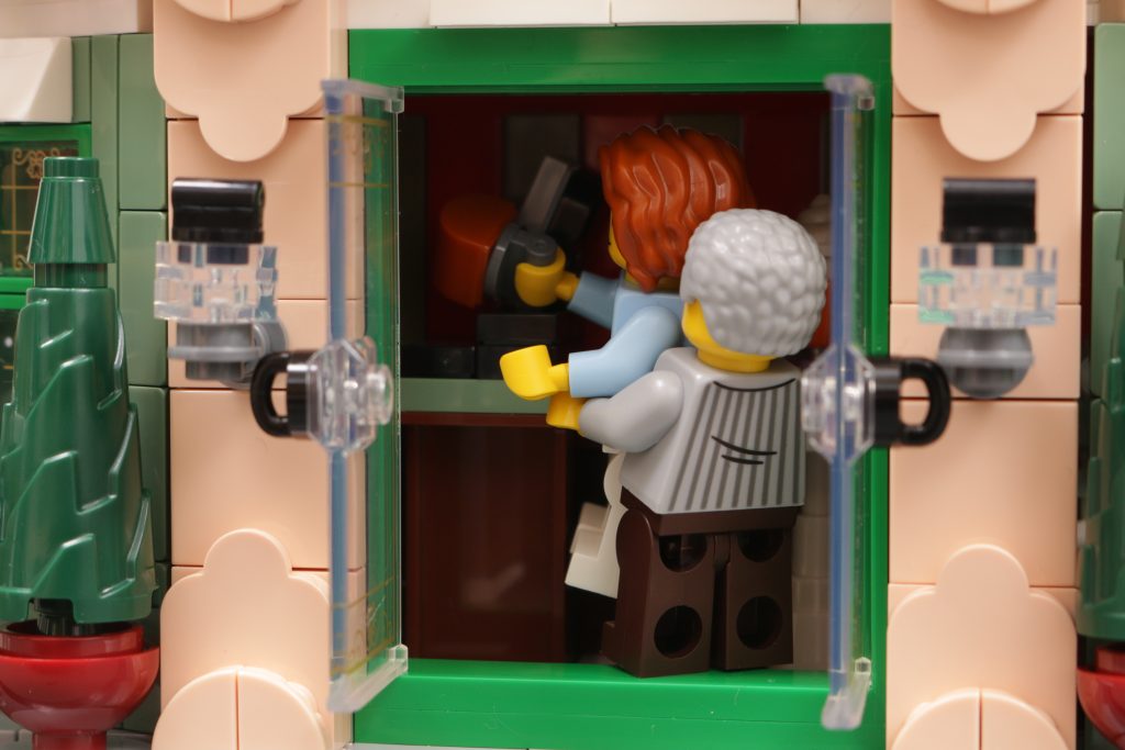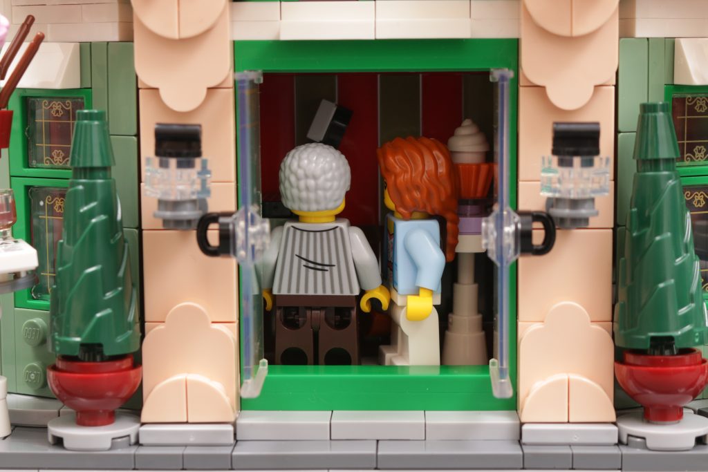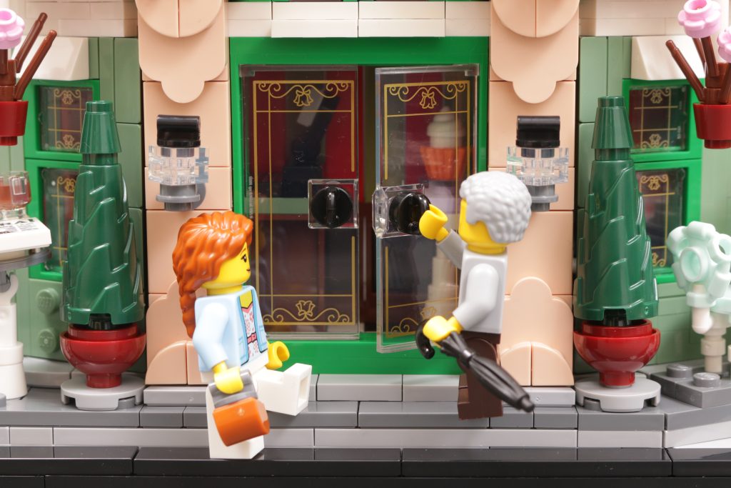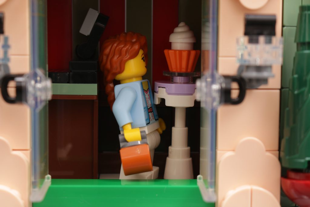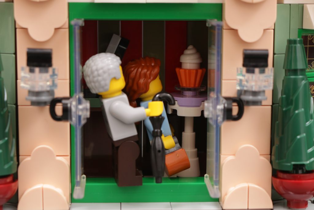 Ein Standard LEGO Die Minifigur wird beispielsweise ein wenig Hilfe brauchen, um auf die Hochstühle vor dem Veranstaltungsort zu klettern, während das Gebäude selbst ein wenig zu groß und zu groß für sie wirkt. Die Türen bestehen möglicherweise aus denselben Teilen wie modulare Gebäude, aber wenn Sie sie öffnen, wird der winzige Teil des Innenraums sichtbar, der in der Fassade sichtbar ist – ein Tisch und eine Theke – und Sie werden sehen, dass alles nur ein paar Bolzen außer Reichweite ist.
