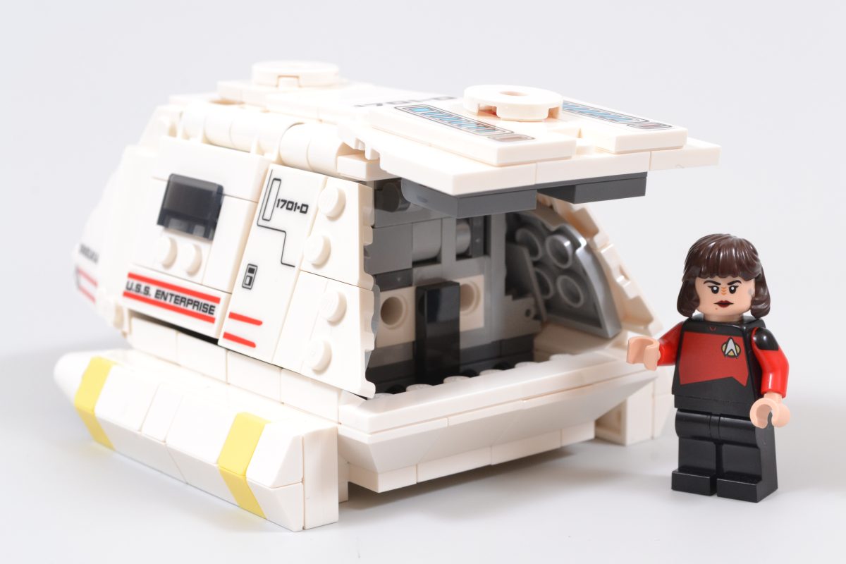 Das erste und bisher einzige LEGO Star Trek Set im Minifigurenmaßstab bietet dank eines aufklappbaren Cockpits, zweier Flügeltüren und einer Heckladeklappe jede Menge Spielmöglichkeiten. Darin ist genug Platz, um die enthaltene Fähnrich Ro Laren Minifigur und mindestens ein weiteres Mitglied der Star Trek-Familie unterzubringen. 10356 USS Enterprise NCC-1701-D'schrauben.