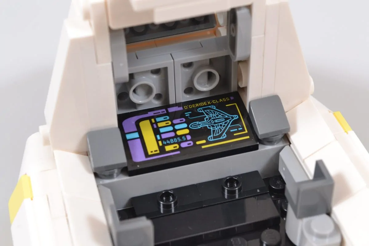 Das aus 261 Teilen bestehende, überwiegend weiße Modell ist über 6 cm hoch, 12 cm lang und 8 cm breit und stellt eine unglaublich genaue Interpretation des Föderationsschiffs dar, das vom leitenden beratenden Illustrator und Designer Andrew Probert entworfen wurde und in der Star Trek: The Next Generation-Folge „Time Squared“ der zweiten Staffel vorgestellt wurde.