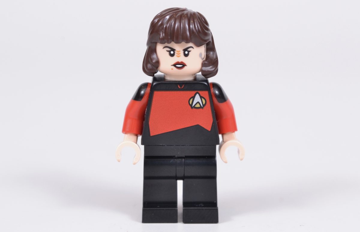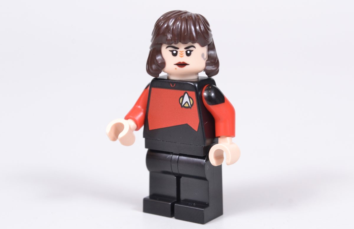 Apropos ersteres: Ro Laren verfügt über einen bedruckten Vorder- und Rückenteil, der den rot-schwarzen Uniformen von Captain Jean-Luc Picard und Commander William Riker in den deutlich größeren LEGO-Figuren entspricht. Icons Das Set beinhaltet auch einen detailgetreuen, doppelseitigen Kopfdruck mit traditionellem bajoranischen Ohrring und Stirnschmuck, jedoch ohne Accessoires wie Phaser oder Tricorder.