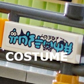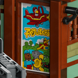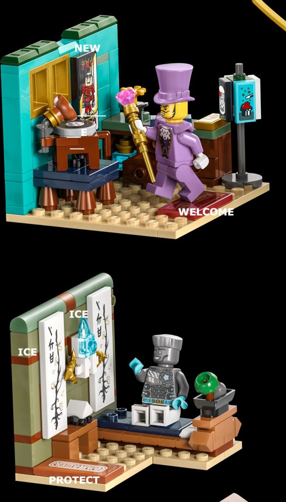 Nach dem Fabuland-Poster, 70620 NINJAGO City wird deutlicher durch eine Werbung für einen Kostümladen verwiesen, der das gleiche Farbschema wie der größere Laden im Obergeschoss des ursprünglichen NINJAGO verwendet City.