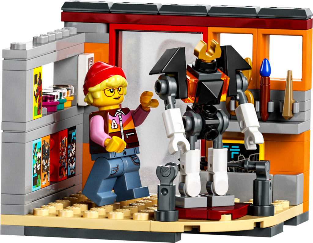 Der Modellbaushop in 71837 Ninjago City Workshops hat viele Mechs aus älteren Wellen von NINJAGO, einschließlich des ersten Samurai X-Mechs, aber ein Aufsteller auf dem Dach des Ladens und im Laden sind beide eine Hommage an 71821 Coles Titan-Drachen-Mech.