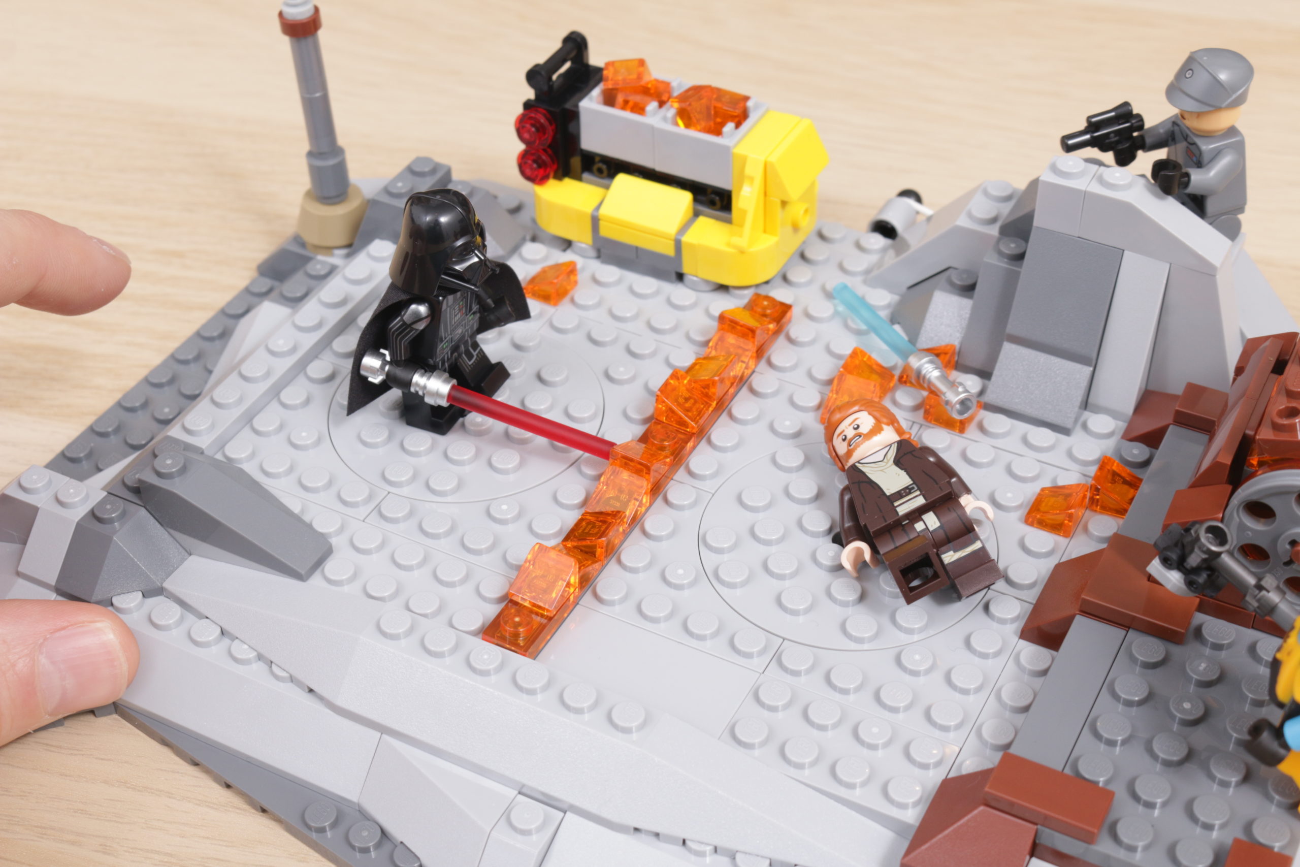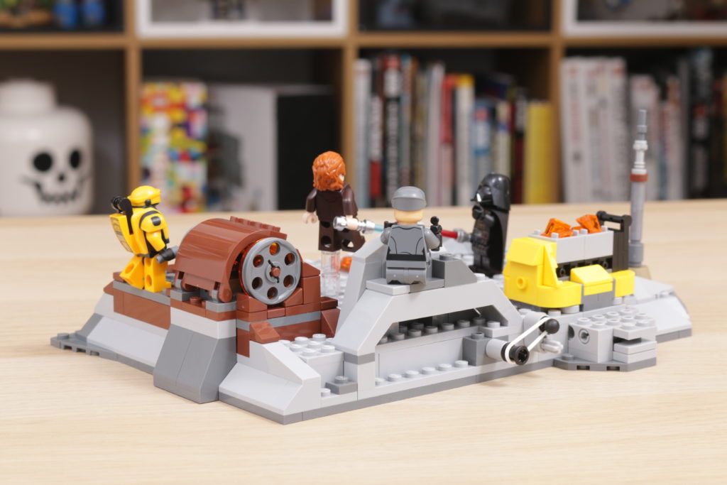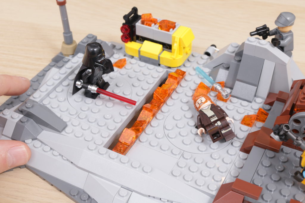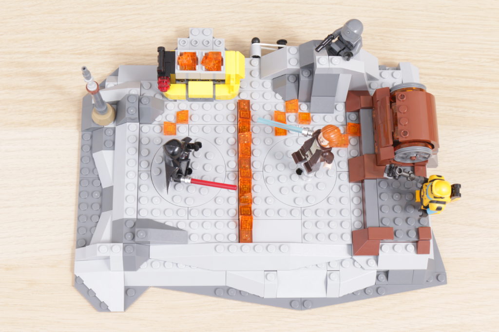 Der Preis ist der Knackpunkt, denn das Set ist tatsächlich seinem Ausgangsmaterial treu und bietet Spielfunktionen, die die minimale Action auf dem Bildschirm besser widerspiegeln als erwartet. In die Basis sind Drehscheiben eingeBauen, um Darth Vader und Obi-Wan Kenobi im Kampf zu schwenken, einige Behälter mit brennendem Gewürz, die über den Boden verschüttet werden können, und die Möglichkeit, die Basis leicht zu verschieben und noch mehr brennendes Gewürz aufzuwirbeln, über das Obi-Wan gezogen werden kann.