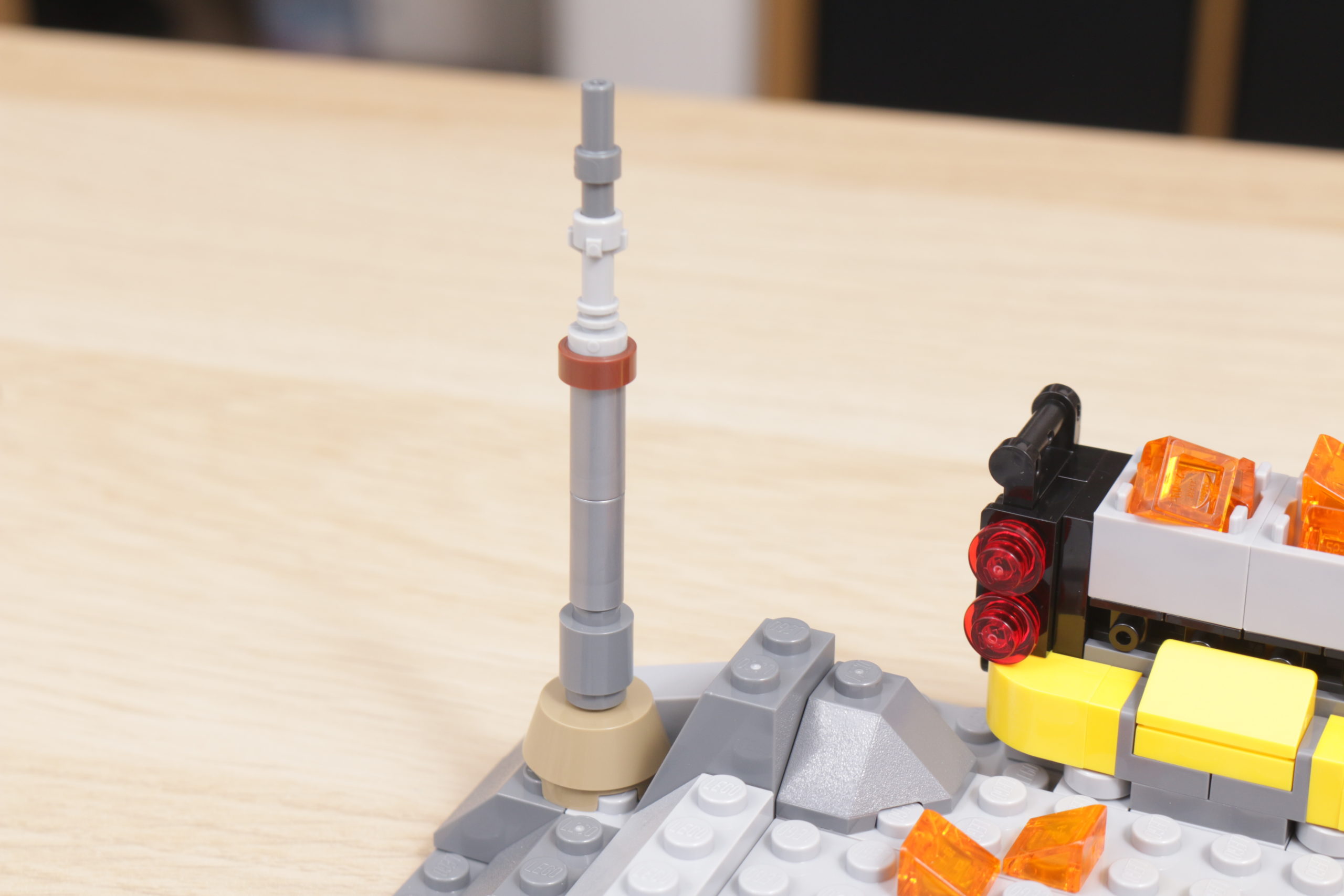 Das macht es zu einem schwierigen Verkaufsschlager, da es weder ein praktisches Spektakel zum Herumspielen noch eine detaillierte, ansprechende Konstruktion zum Ausstellen ist. In seiner einfachsten Form ist es ein großes, flaches Rechteck aus grauen Platten und Steinen, auf dem vier mitgelieferte Minifiguren stehen können. Einige Spielfunktionen sind eingeBauen, um das nachzuahmen, was auf dem Bildschirm zu sehen ist.
