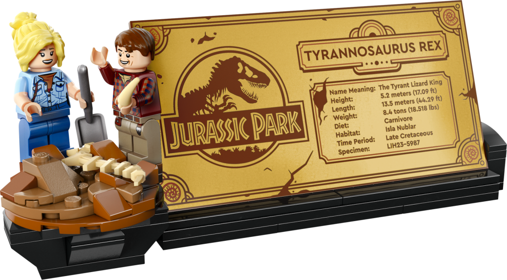 Es scheint jedoch, dass die maximale Länge leicht anpassbar sein wird, da das Skelett über viele Gelenke an Kopf, Kiefer, Armen und Schwanz verfügt. Die gesamte Struktur wird von einem schwarzen Ausstellungsständer getragen, auf dem sich eine gedruckte Informationstafel befindet (beachten Sie, dass es sich eher um Jurassic Park als um Jurassic World Logo), während im gesamten Build auch versteckte Ostereier verstreut sind.