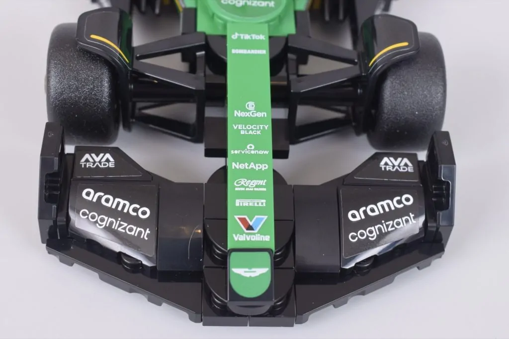 Es gibt auch mehr Abwechslung bei den verwendeten Teilen, die dazu beitragen, die Dinge frisch zu halten, von Gittern an der Unterseite des Autos bis zu einem Schwert, das anstelle des Skis verwendet wird, den andere LEGO Speed Champions Formula 1 Autos haben auf dem oberen Lufteinlass. Die Unterschiede sind gering, aber spürbar, was 77245 Aston Martin Aramco F1 AMR24 eine schmalere Silhouette, wenn man es von oben oder hinten betrachtet.