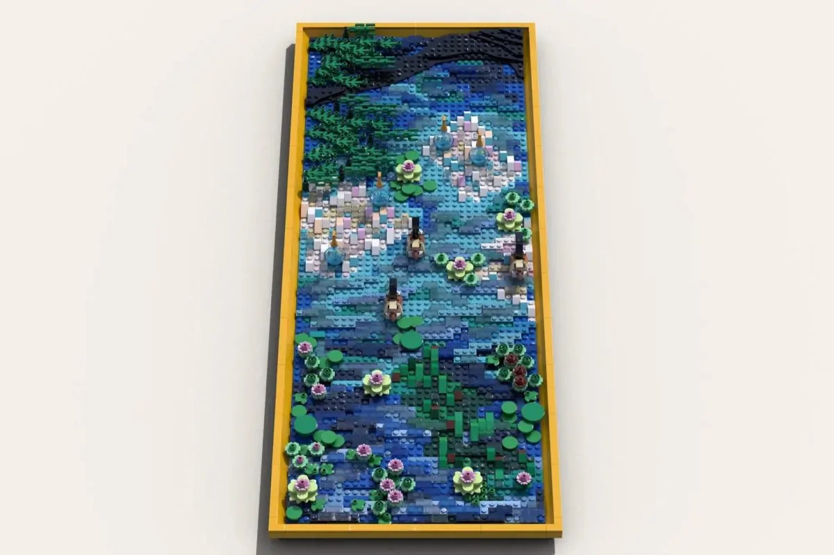Entworfen von Larry_land1, Seerosen von Claude Monet hat 10,000 Unterstützer gewonnen auf LEGO IdeasDamit rückt es der Realisierung eines zukünftigen Bühnenbildes einen Schritt näher. Es stellt eine der berühmtesten Serien des Impressionisten nach. LEGO Für dieses LEGO-Projekt wurden Platten, Fliesen und andere LEGO-Steine verwendet, um die sanften Farbverläufe des Originalwerks nachzubilden. Die Werkgruppe ist als Ganzes zu betrachten; das Projekt wurde von „Les Nuages“, „Les Deux Saules“ und „Reflets Verts“ inspiriert.