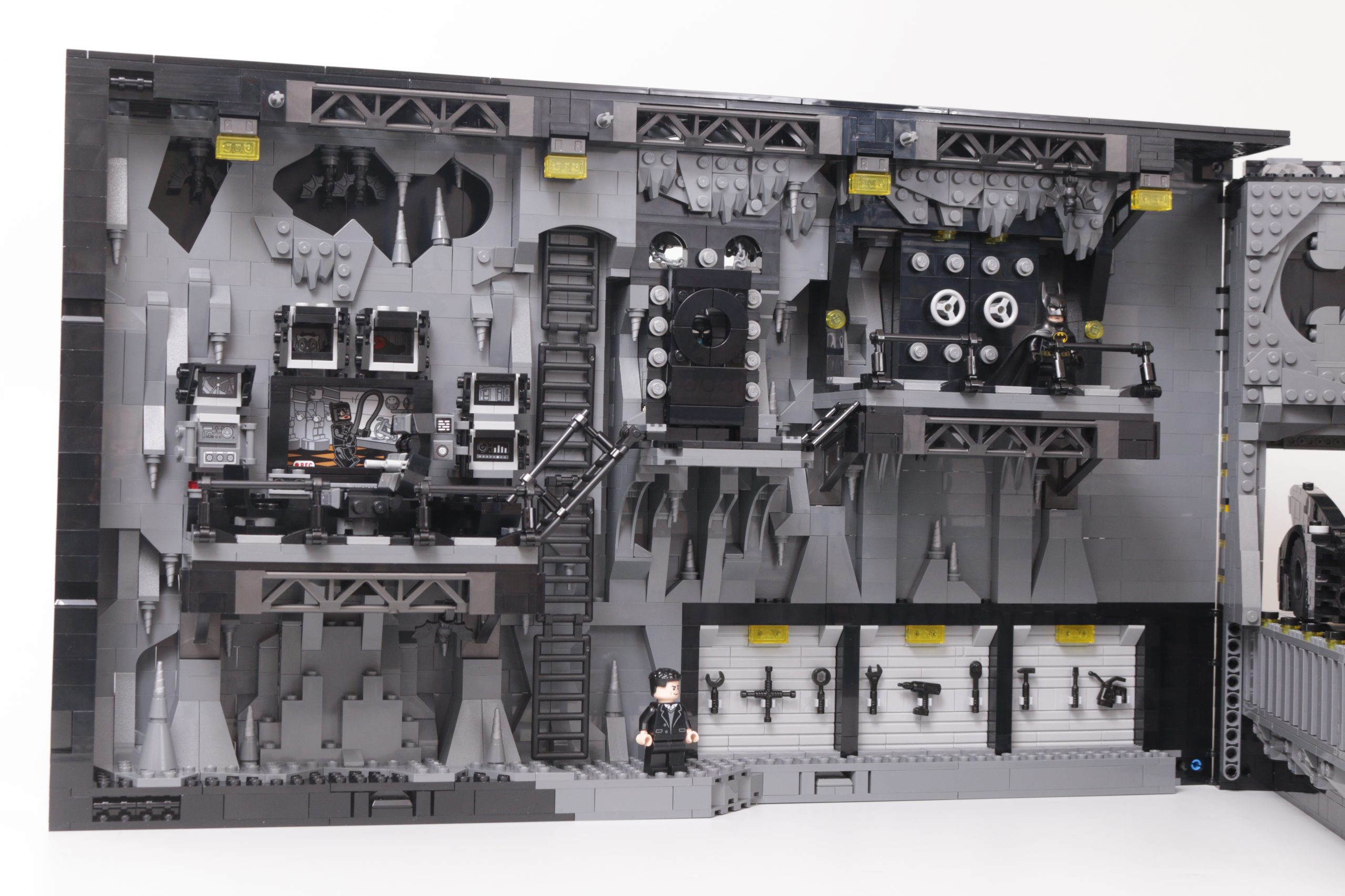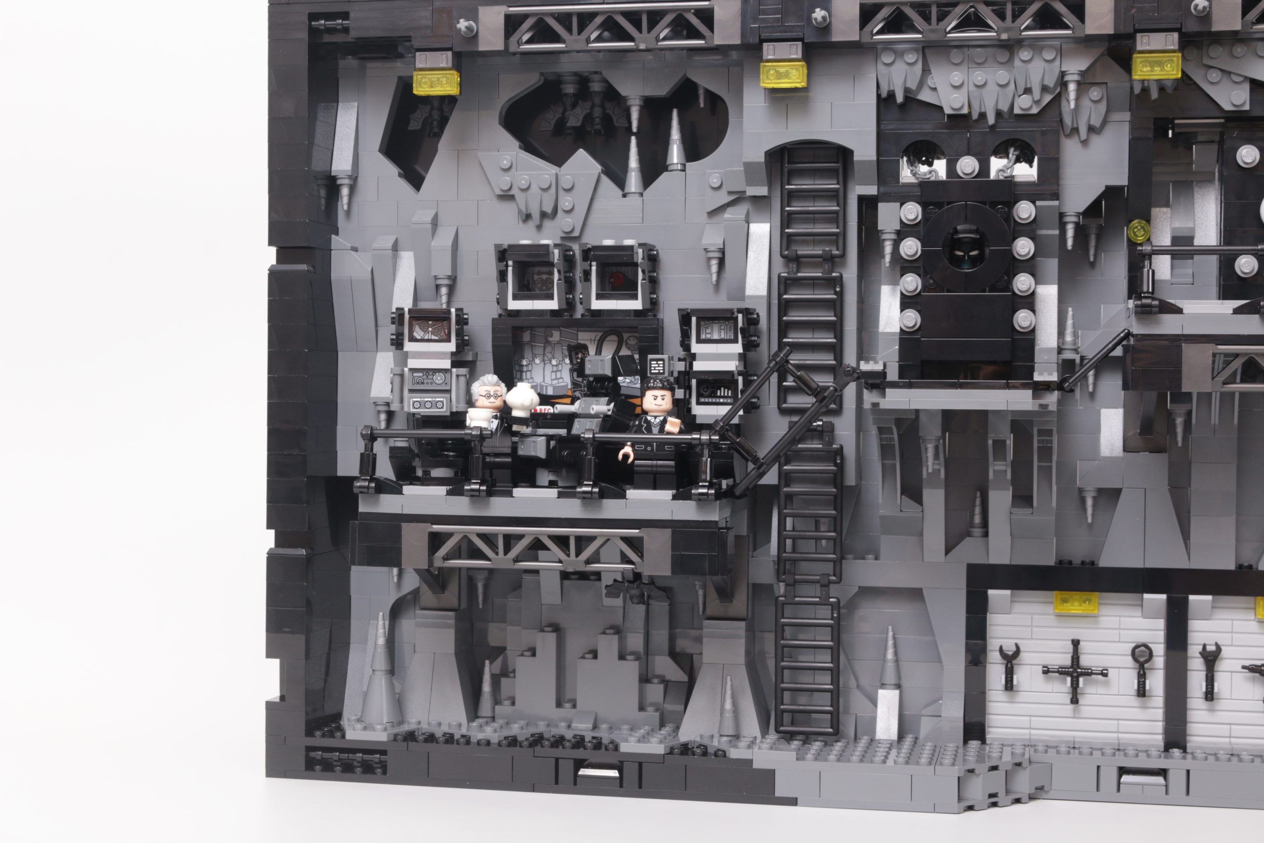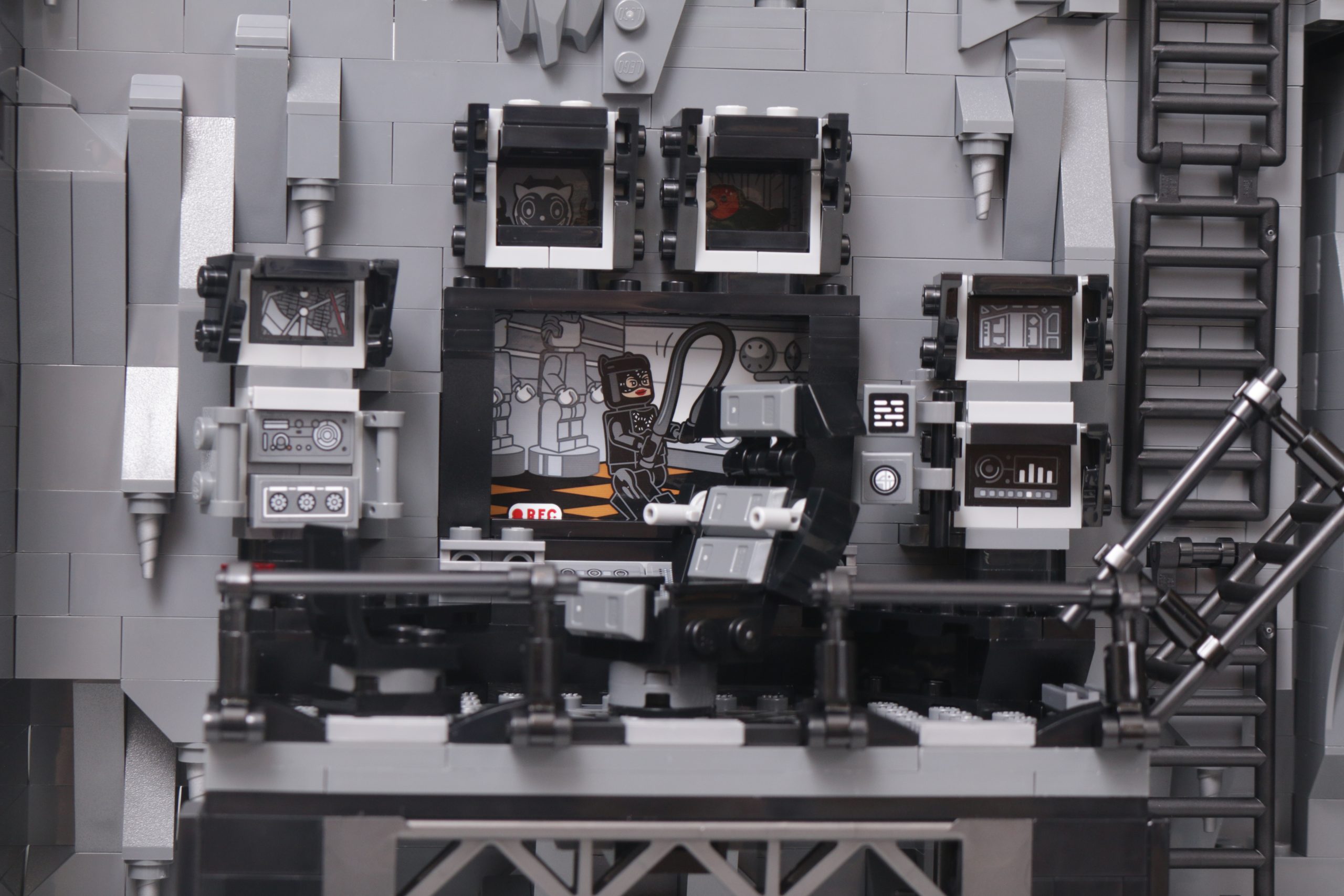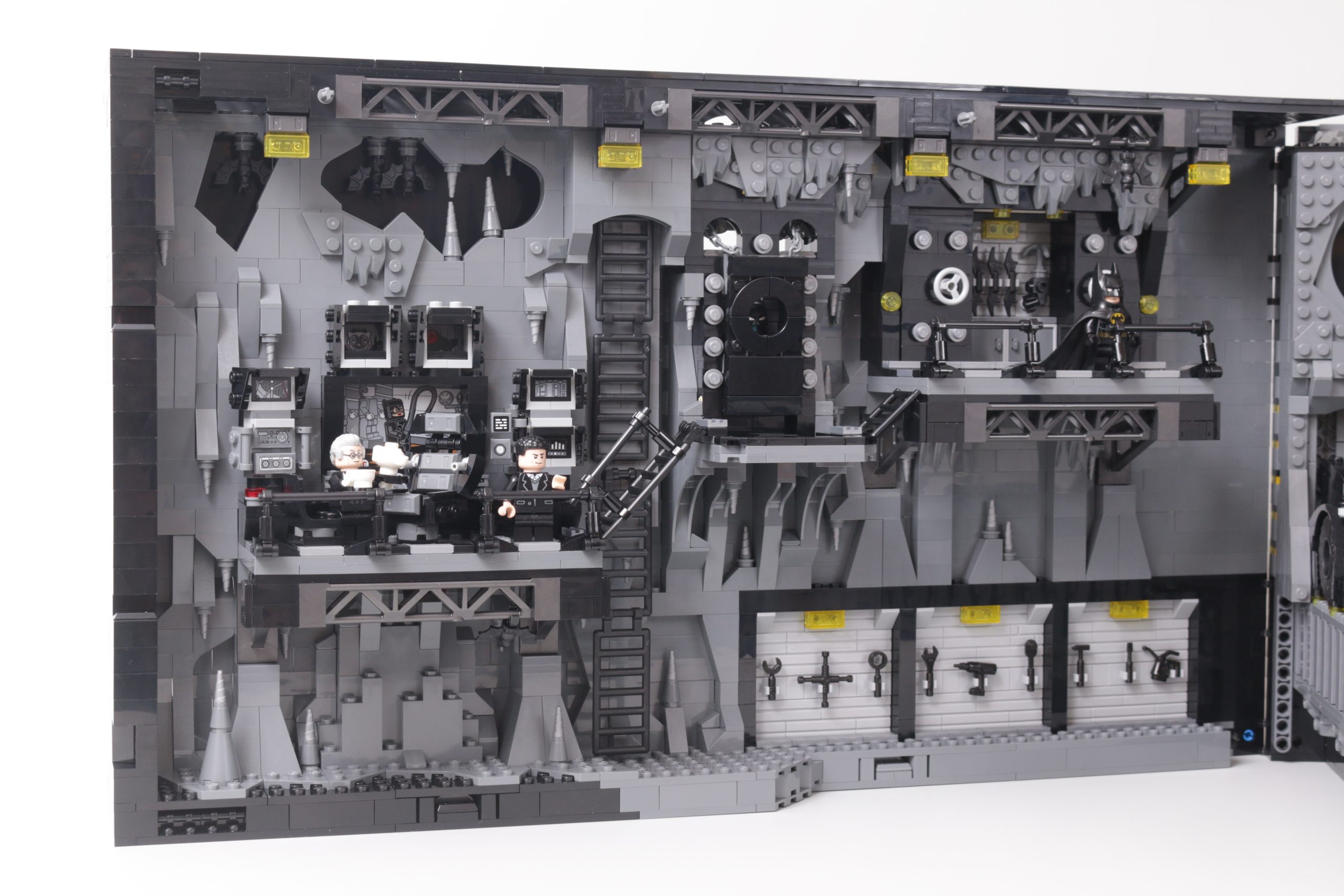 Wie bereits erwähnt, ist das Set voller Details in der Bathöhle und bietet glaubwürdige kleine LEGO-Versionen des Bat-Computers, des Batsuit-Stauraums (Bat-Garderobe?) und des Waffenlagers sowie eine große, lange Plattform für das mitgelieferte Batmobil. Jeder Bereich ist ansprechend gestaltet und meistert die Herausforderung, nur in zwei Farben zu bauen, mit Bravour – kurz gesagt, man bemerkt keine kreativen Kompromisse in der monochromen Natur des fertigen Modells, sondern nur die gotischen Tim-Burton-Vibes, die ein solches Bauwerk vermitteln sollte.
