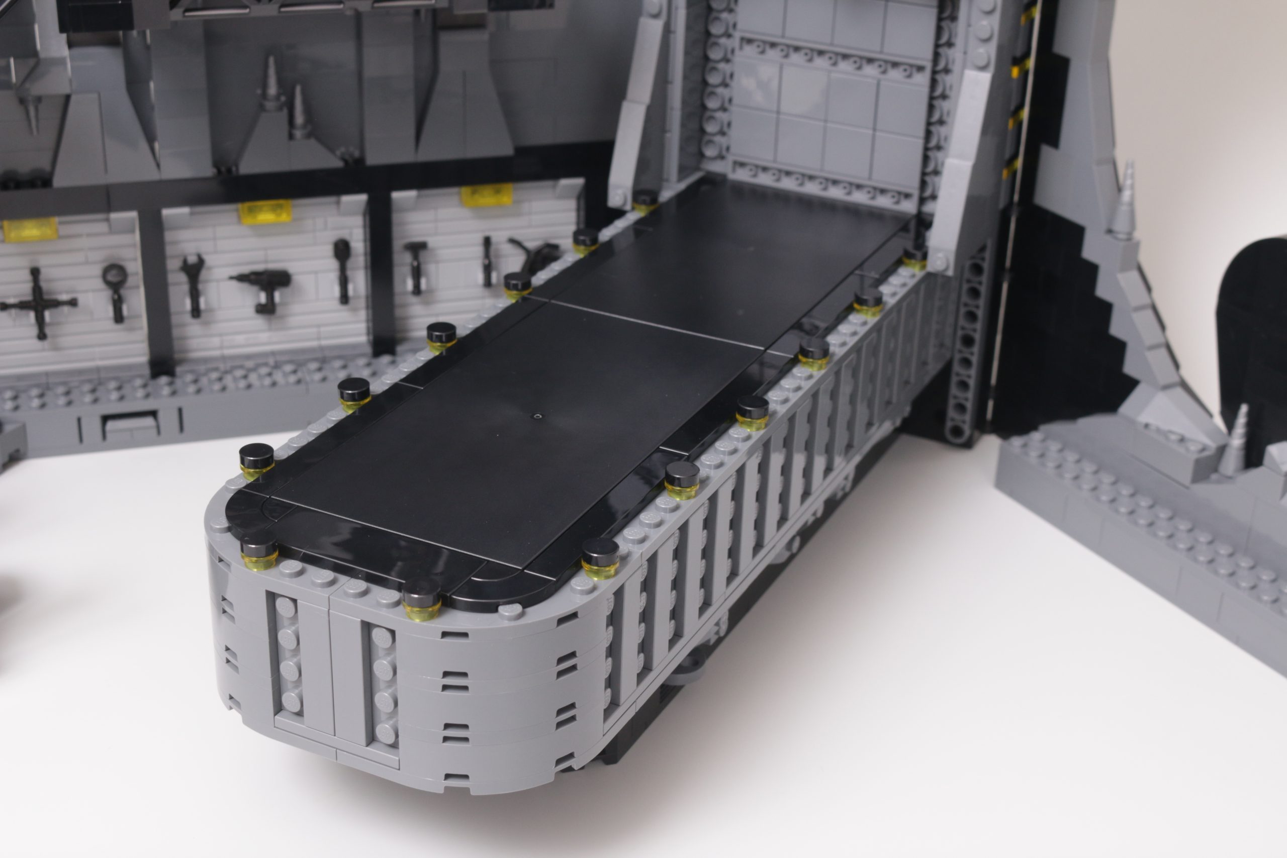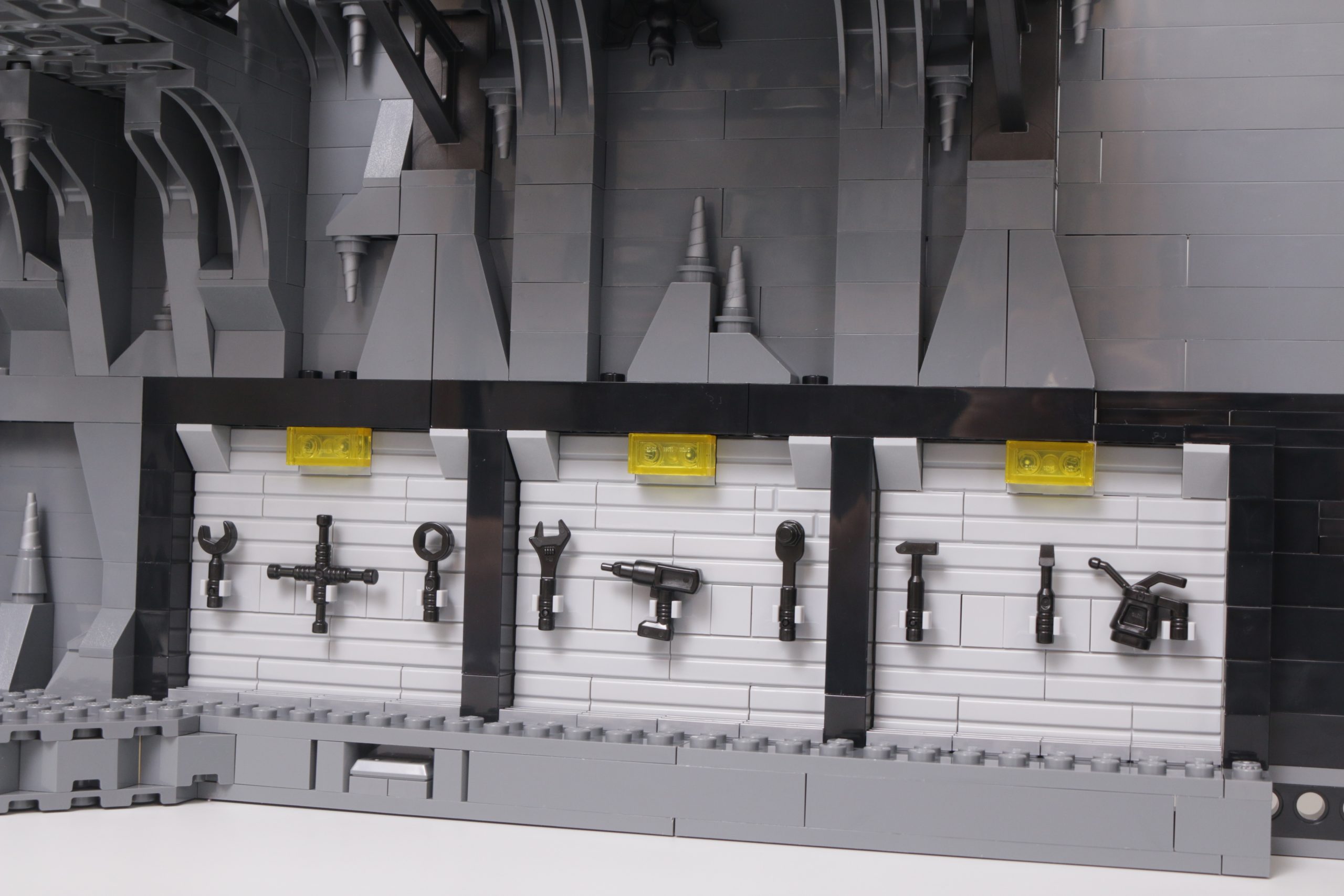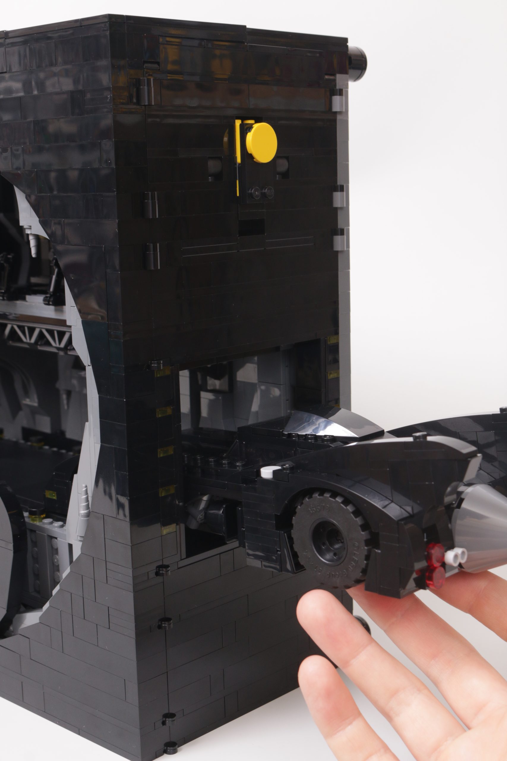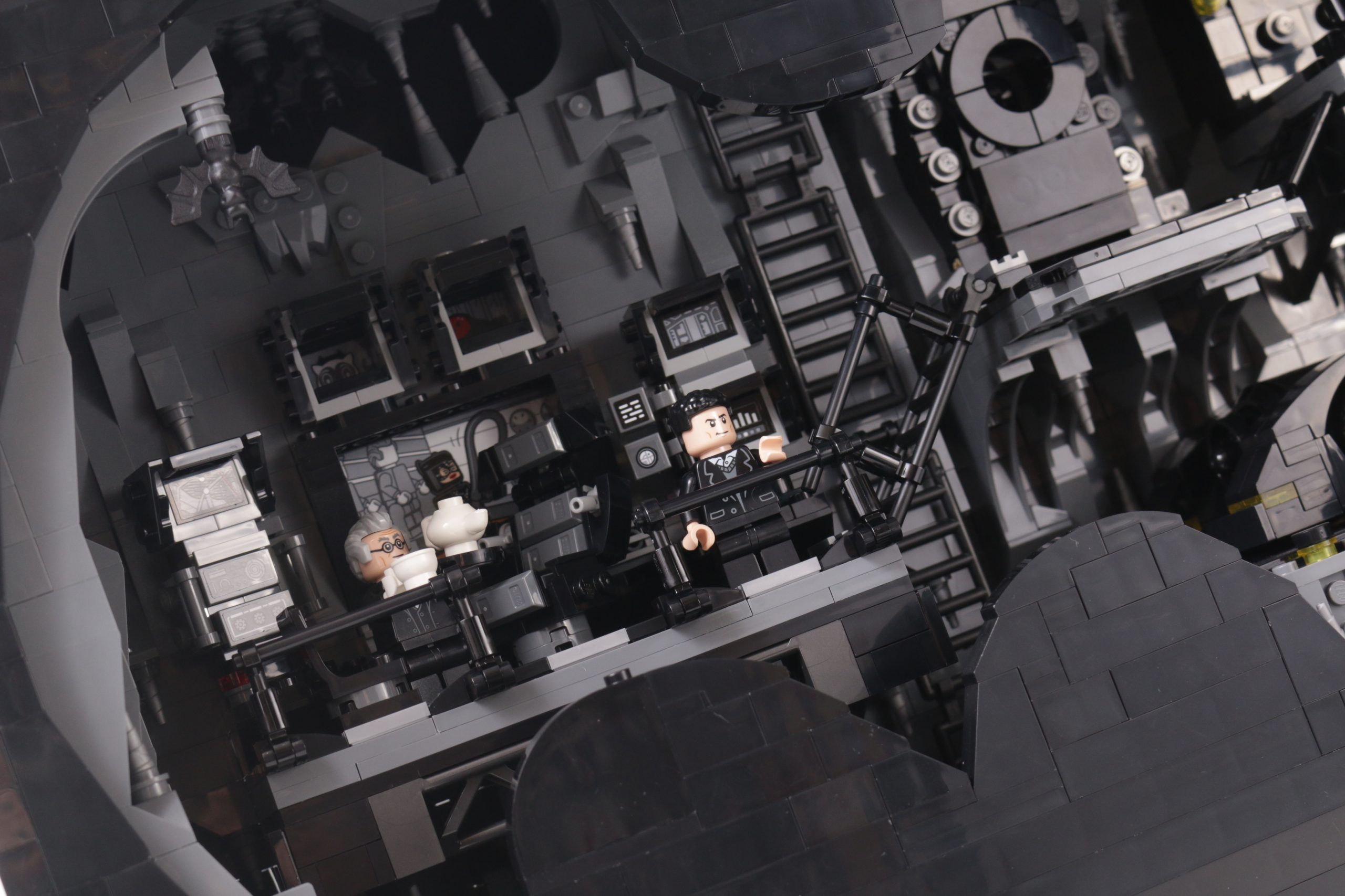 Wie bereits erwähnt, ist das Set voller Details in der Bathöhle und bietet glaubwürdige kleine LEGO-Versionen des Bat-Computers, des Batsuit-Stauraums (Bat-Garderobe?) und des Waffenlagers sowie eine große, lange Plattform für das mitgelieferte Batmobil. Jeder Bereich ist ansprechend gestaltet und meistert die Herausforderung, nur in zwei Farben zu bauen, mit Bravour – kurz gesagt, man bemerkt keine kreativen Kompromisse in der monochromen Natur des fertigen Modells, sondern nur die gotischen Tim-Burton-Vibes, die ein solches Bauwerk vermitteln sollte.