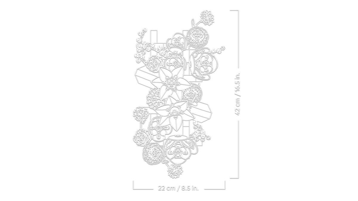 Das Set besteht aus einem Wandrahmen als Basis, der mit zwei großen Kamelien, drei kleinen Kamelien, zwei Waldreben, drei Ranunkeln, zwei roten Rosen, einer Hortensie, drei Kornblumen, zwei Mimosenzweigen, zwei Wachsblumenzweigen und zwei großen Blättern dekoriert ist. Die künstlichen Pflanzen können nach Belieben an der Wand angeordnet werden.