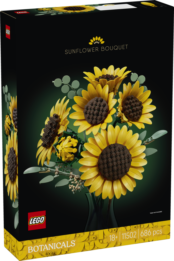 Ähnlich wie bei früheren LEGO-Blumensträußen, 11502 Sonnenblumenstrauß Dieses Arrangement bildet sechs Sonnenblumen in verschiedenen Entwicklungsstadien nach. Dazu gehören eine Sonnenblumenknospe, drei Sonnenblumen in der frühen Blütephase, zwei große, voll erblühte Sonnenblumen und vier Eukalyptuszweige für einen Hauch von Abwechslung. Das 686-teilige Set kostet wie die vorherigen Sträuße 54.99 £ / 59.99 $ / 59.99 € und lässt sich durch Verändern der Höhe und des Winkels der Blütenblätter und Stiele individuell arrangieren.