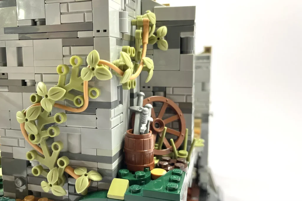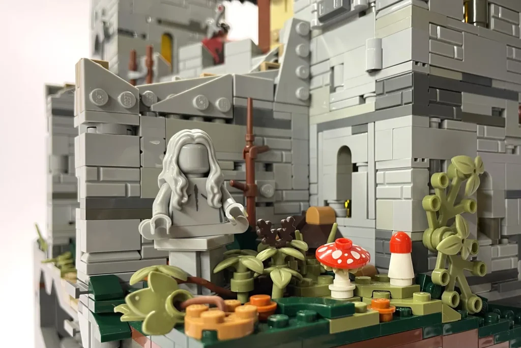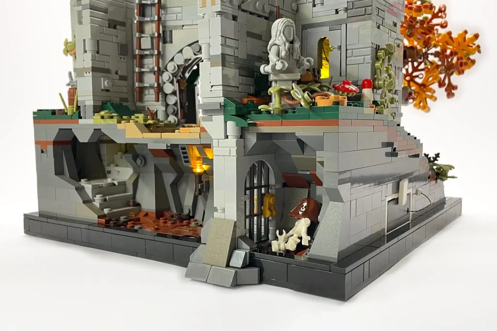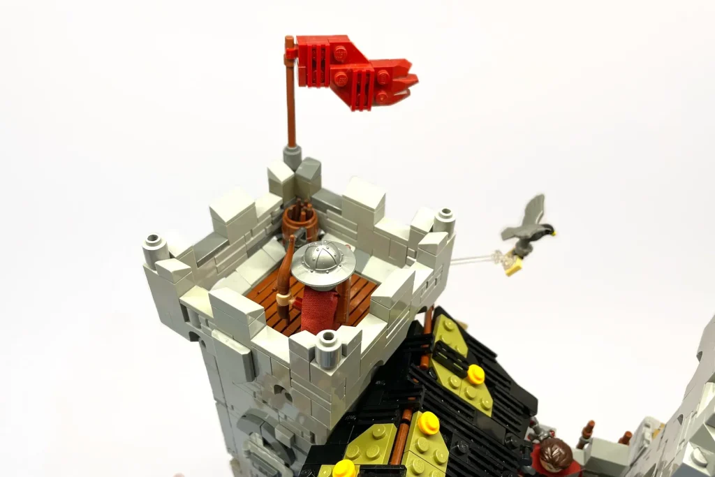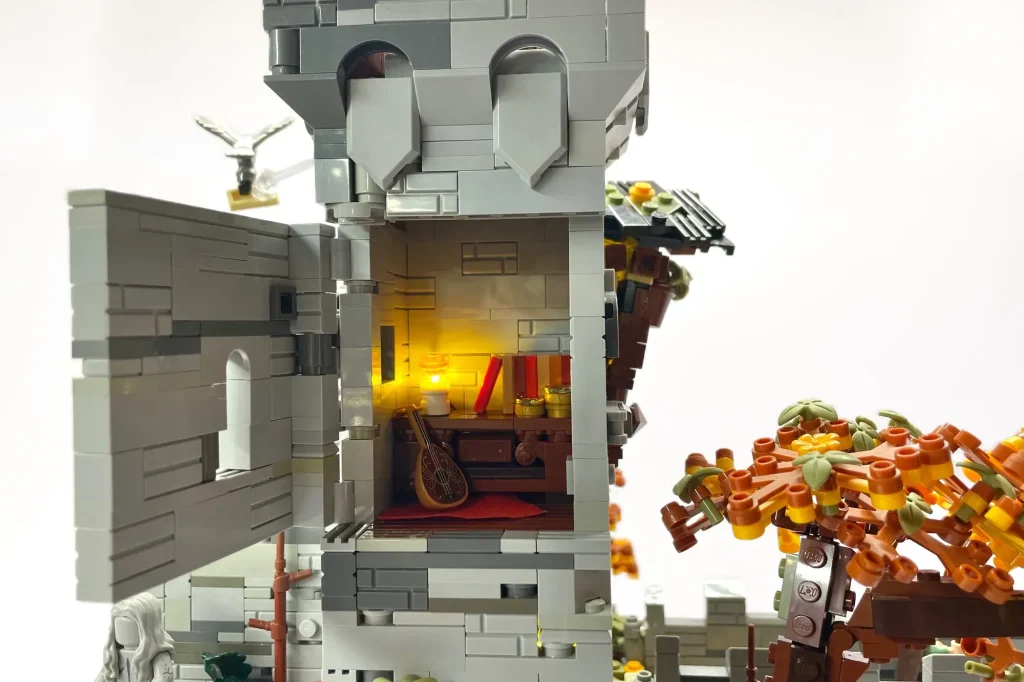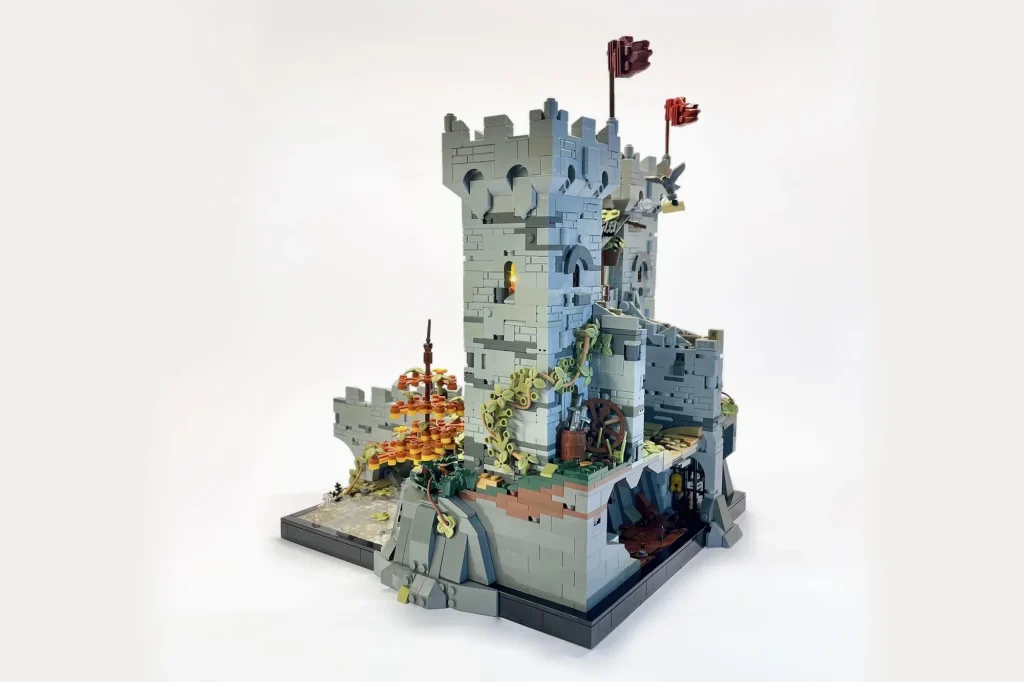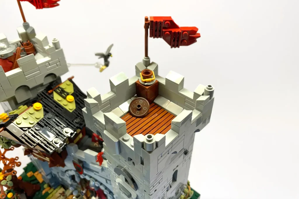 „In allen Burgen-Sets gibt es immer einen ungewöhnlichen Winkel als Teil der Komposition oder ein klappbares Element, das den Bau verändert“, schrieb der Fan-Designer. „Um dies widerzuspiegeln, habe ich meine Burg mit dem Mittelteil schräg geBauen und den linken Turm außerhalb des Rasters platziert, um die Lücken zu verdecken! Außerdem habe ich zwei Innenräume eingeBauen, die durch Klappwände zugänglich sind, die im geschlossenen Zustand unsichtbar sind!“
