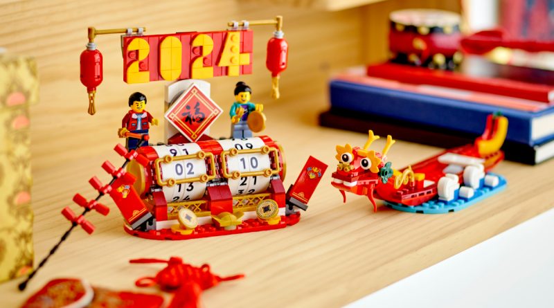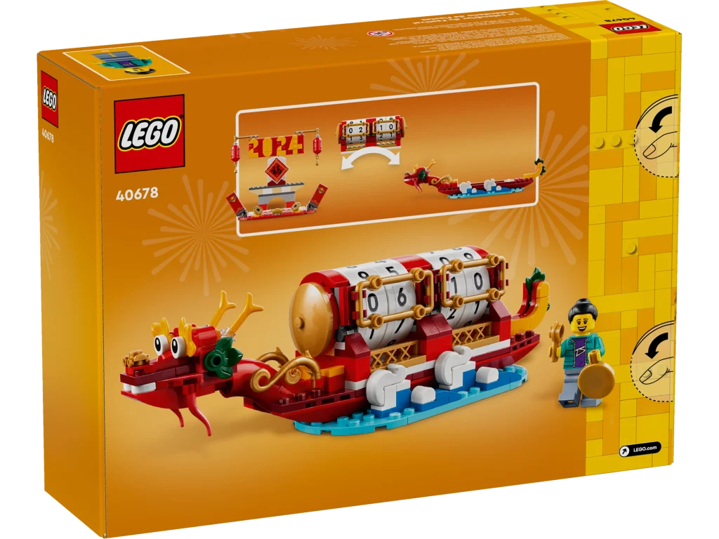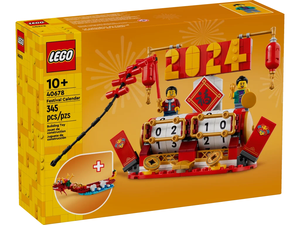 Das größere der beiden neu hinzugekommenen Modelle ist 40678 Festivalkalender, mit abnehmbarem Datumsrad, das entweder auf dem 2024-Stand oder dem Drachenboot angezeigt werden kann. Im Lieferumfang sind zwei Minifiguren zur Präsentation auf dem Ständer sowie anderes Zubehör enthalten.