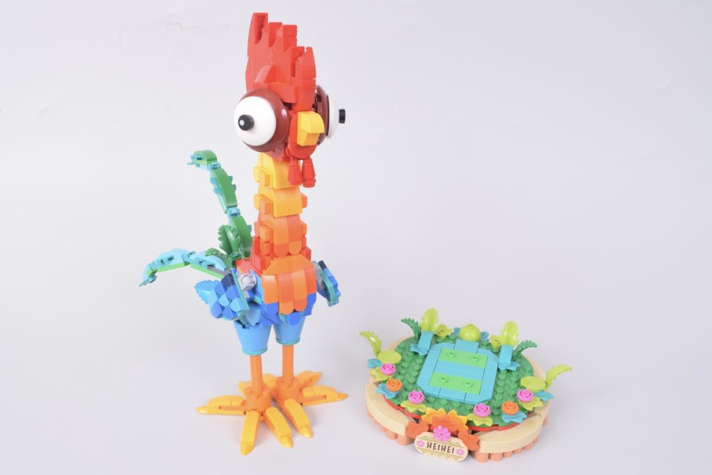 43272 Heihei hat ein Gesicht, das vielleicht nur eine Mutter lieben könnte, mit einem Blick, der direkt in Ihre Seele zu blicken scheint. Er ist jedoch mehr als nur sein starrer Blick, denn über 500 Teile stecken in seinen mehrschichtigen Regenbogenfedern und seinem Rahmen. Er wird mit seinem eigenen blumenbedeckten Ausstellungsständer geliefert und ist bereit, in Ihr LEGO Sammlung – aber ist das LEGO Disney ist es das Set, das es wert ist, gekauft zu werden?