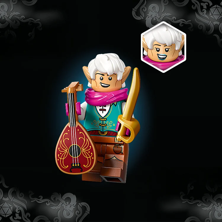 Abgerundet wird unsere Auswahl an 71047 Dungeons & Dragons Minifiguren bei Ziegel-Angebote ist das Elfenbarde für 5.95 £. Ein weiterer farbenfroherer Charakter aus der CMF-Reihe, dieser verfügt über einen doppelseitigen Kopfaufdruck mit Haar- und Ohrenteil, einen auffälligen rosa Schal und ein goldenes Schwert.