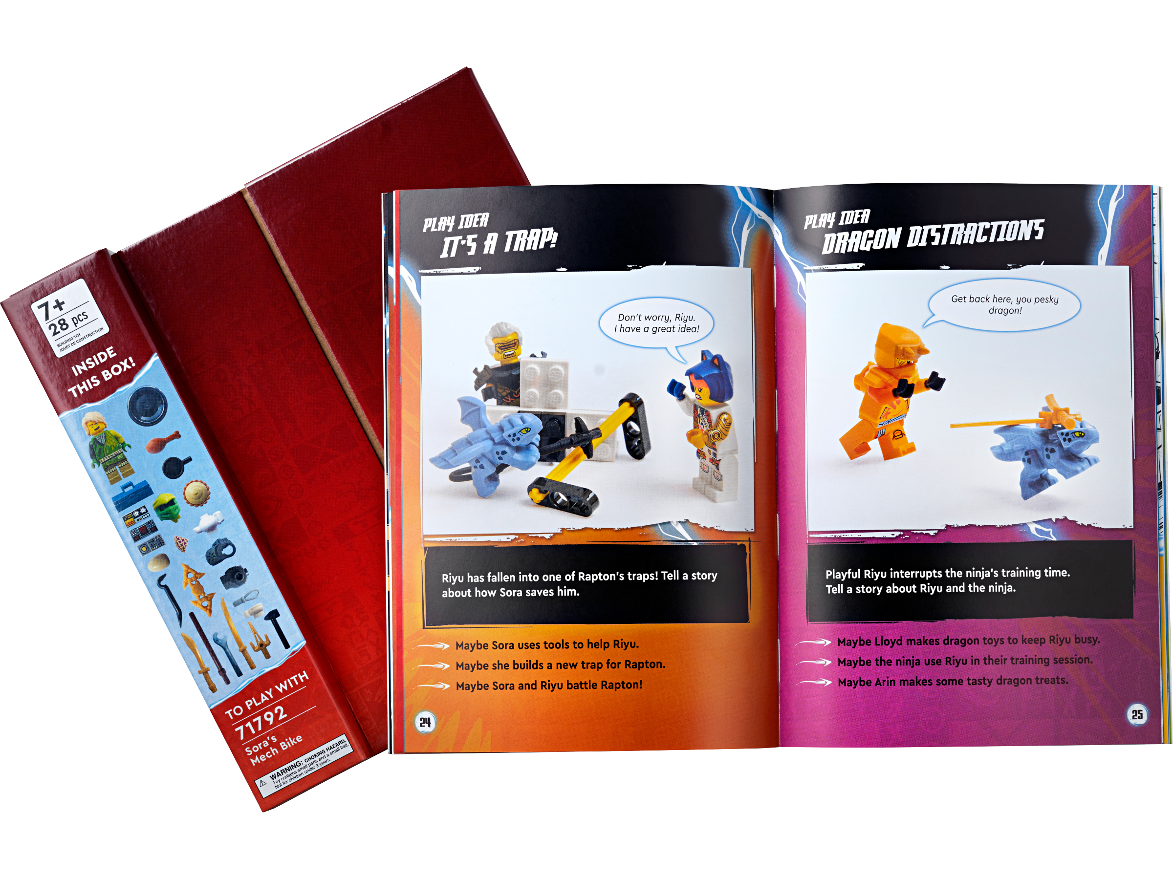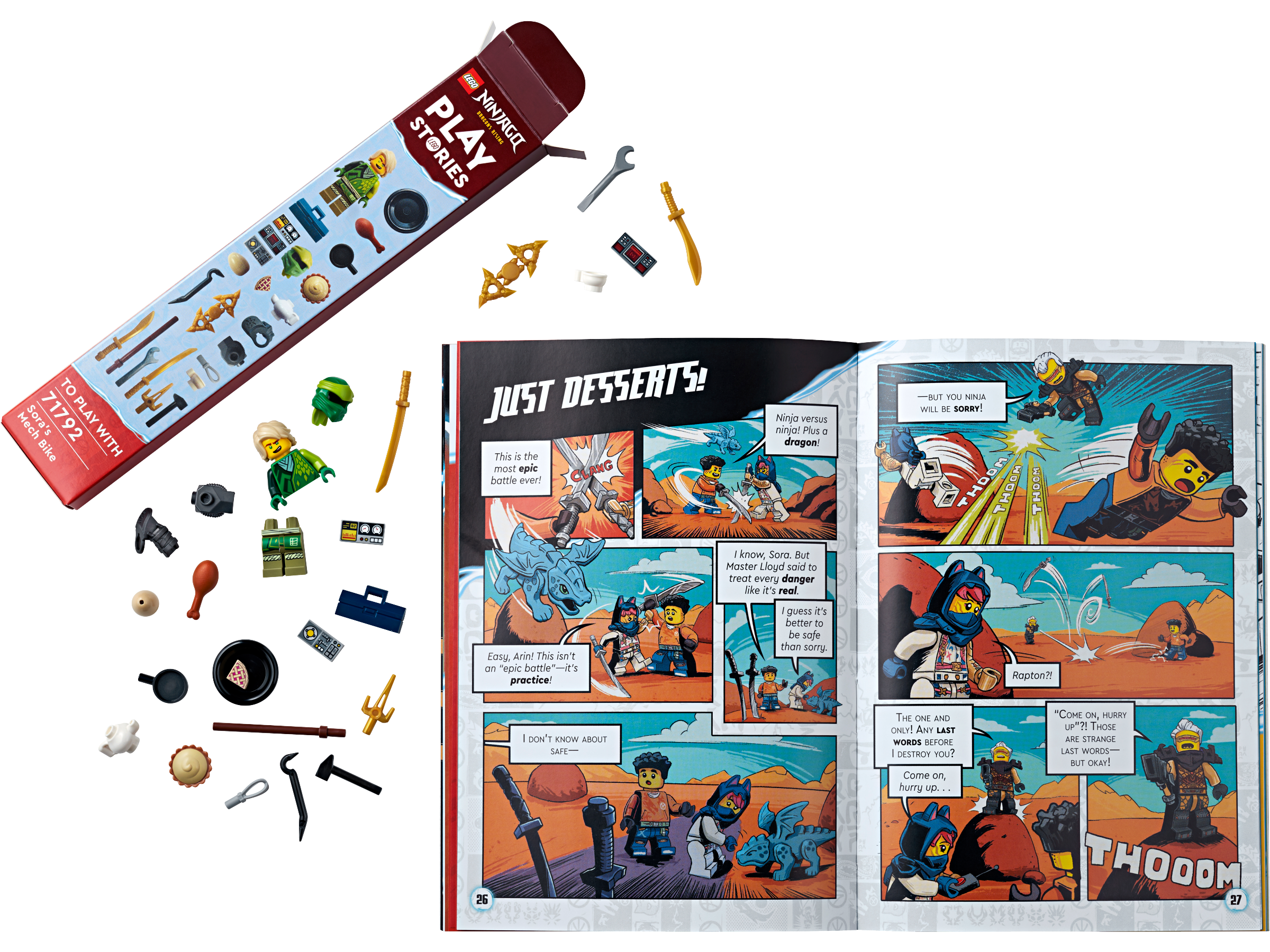 Ebenso 5007946 Spielgeschichten für NINJAGO's 71792 Soras verwandelnder Mech-Bike-Rennfahrer nennt das Set Soras Mech-Bike. Es scheint wahrscheinlich, dass es sich dabei um in der Entwicklung befindliche Namen für die Modelle handelte, aber die Satznummern machen deutlich, welcher Satz zu welchem Buch gehört.