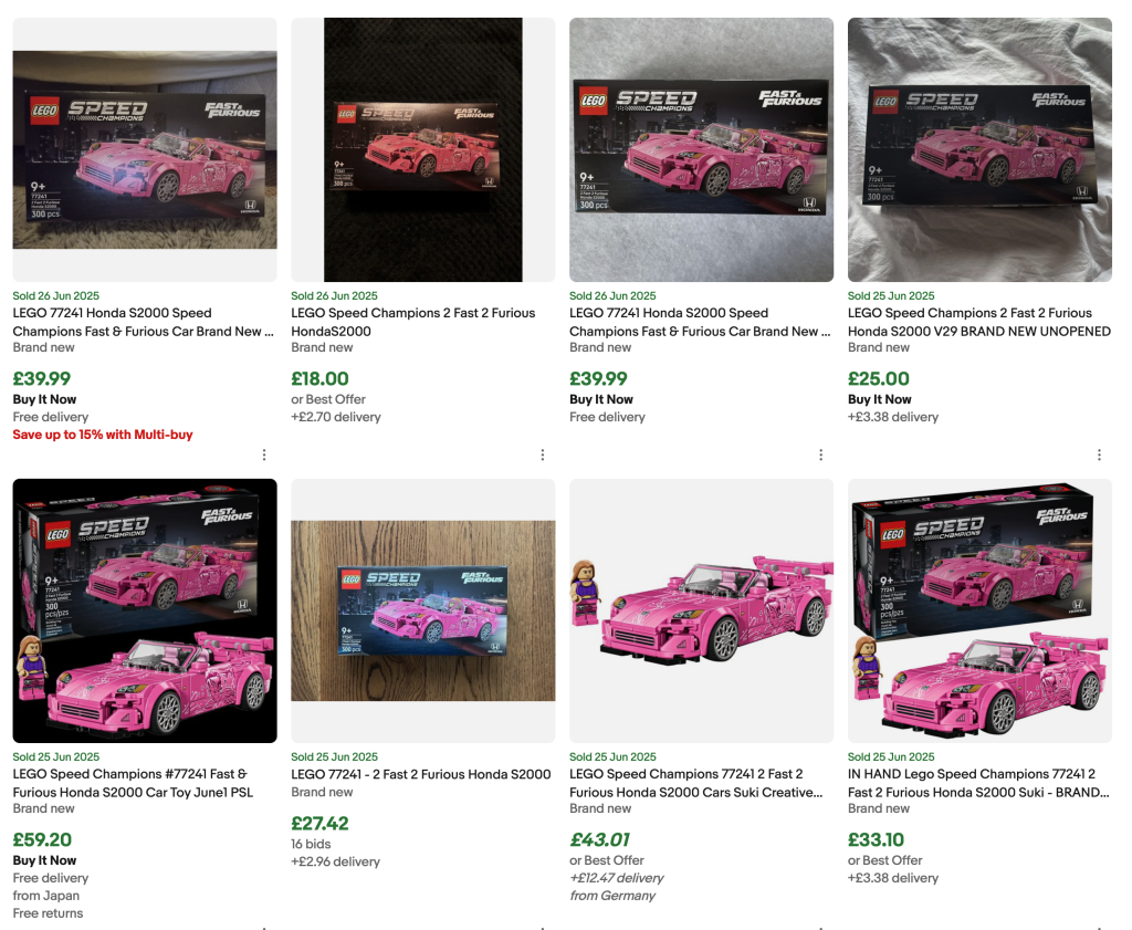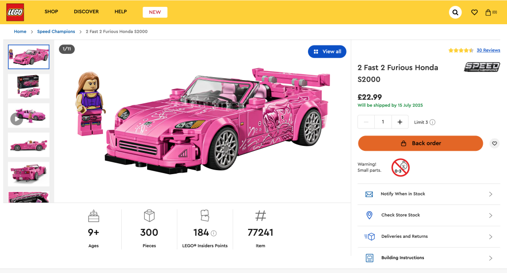 Wenn Sie versucht haben, zu bestellen 77241 2 Fast 2 Furious Honda S2000 und die exklusive Suki-Minifigur am Erscheinungstag in Großbritannien, wurden Sie wahrscheinlich mit einem „Nachbestell-Button“ und der Meldung konfrontiert, dass das Set „bis zum 20. Juni ausgeliefert wird“. Versuchen Sie es heute, müssen Sie bis zum 15. Juli warten. Ähnlich verhält es sich in den USA, wo das 300-teilige Auto bis zum 11. Juli nachbestellt werden muss.