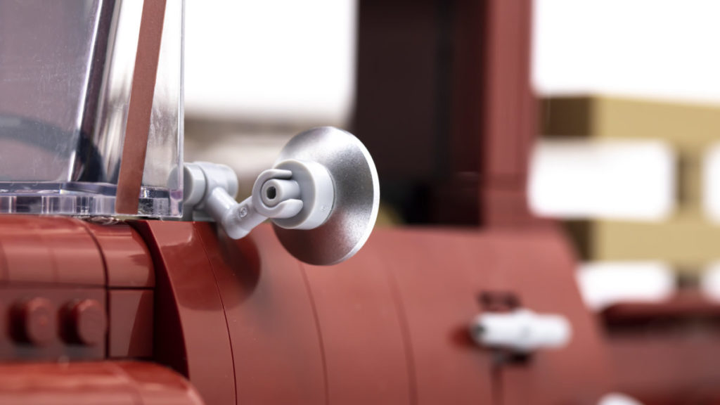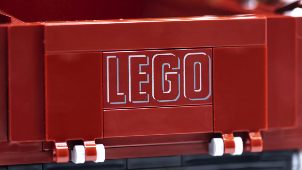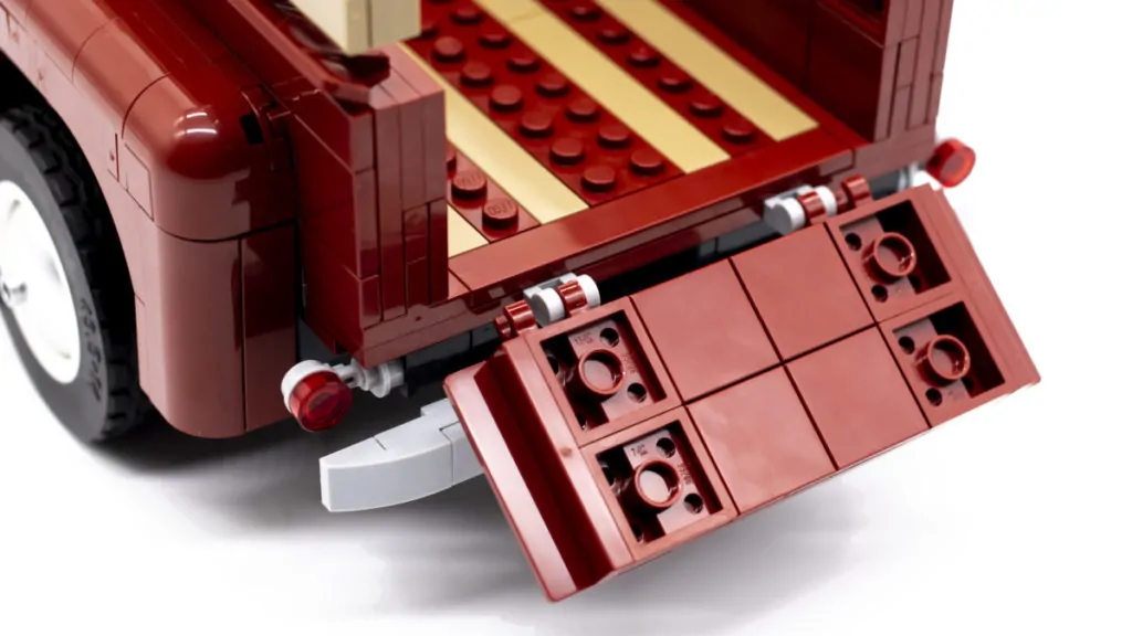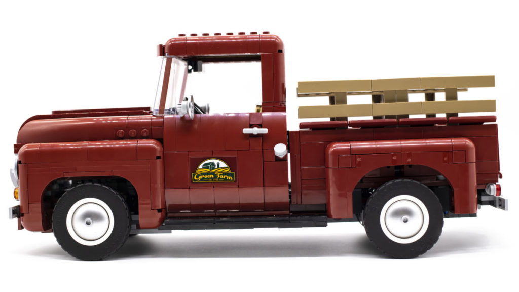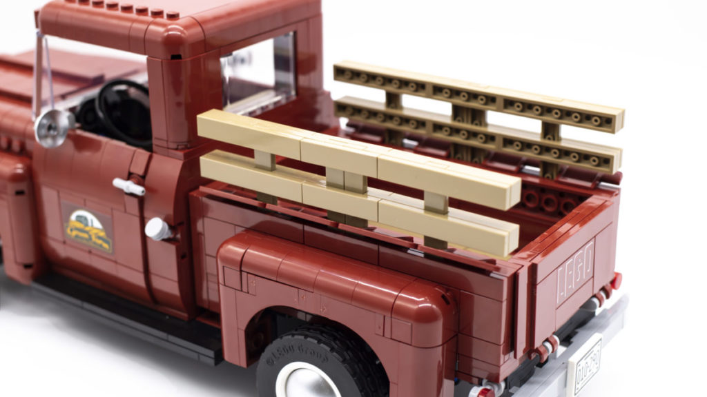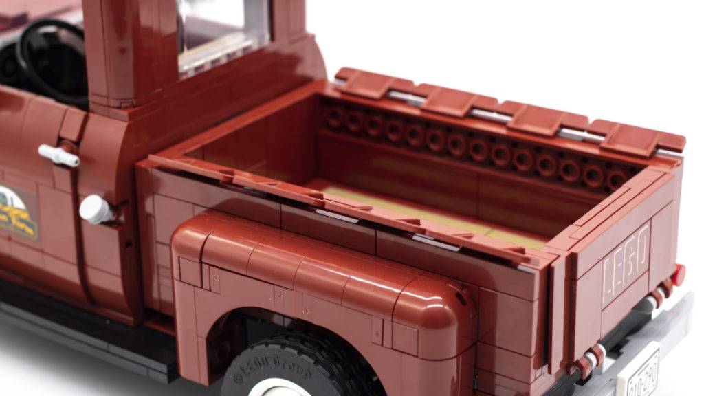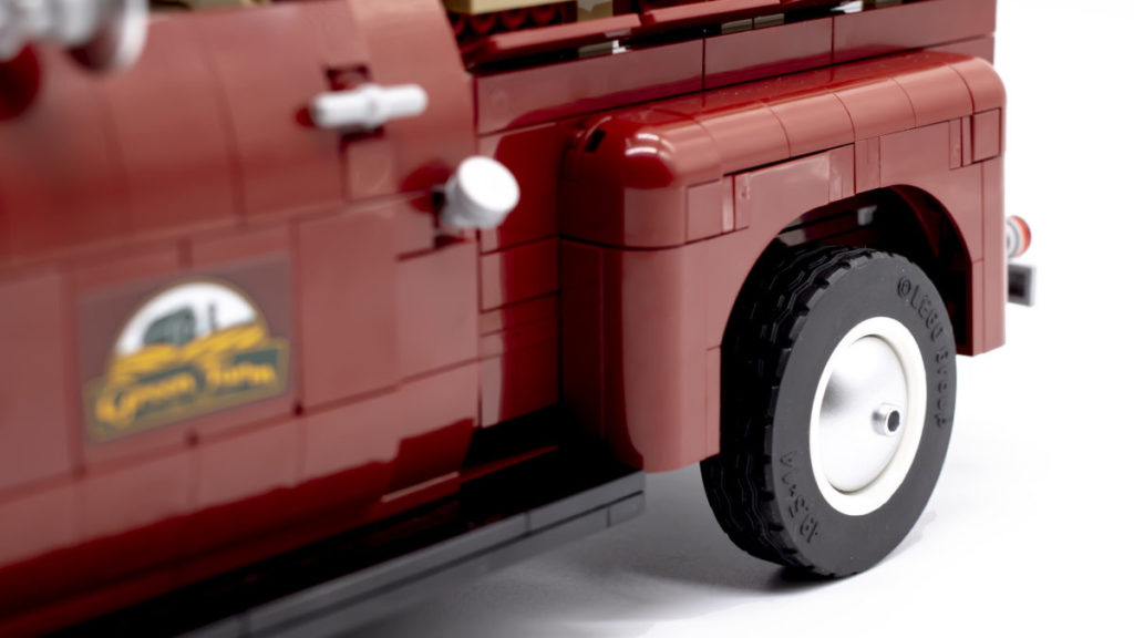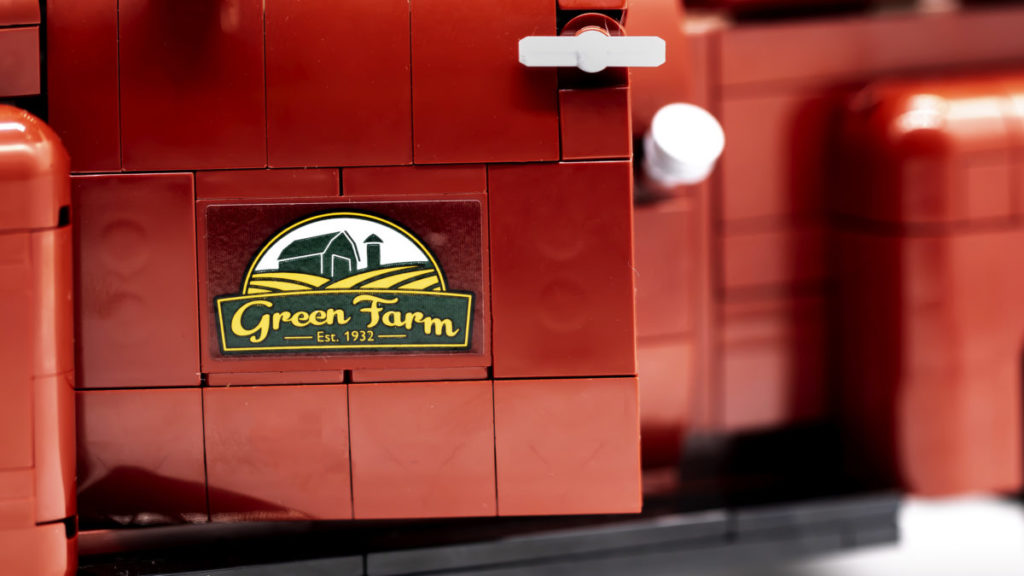 Die Heckklappe lässt sich dank zweier 2×3-Kacheln mit Clips öffnen und ist mit einer aufgedruckten LEGO-Logo-Kachel versehen. Der Rest der Lackierung besteht eher aus Aufklebern als aus gedruckten Teilen, ist aber allesamt gleichermaßen gut gestaltet. Die Green Farm-Logos auf beiden Seiten der Truck-Türen wirken wunderbar authentisch und sind absolut original. Der Aufkleber für den Rückspiegel ist nicht nur eine tolle Idee, sondern trägt auch zur Geschichte des Sets bei.