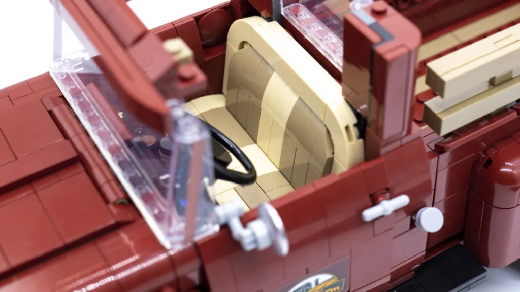 Die zu öffnenden Türen und der Motor, der durch Öffnen der Motorhaube zugänglich ist, sind alle wunderbar elegant, auch wenn sich die Türen im Vergleich zu ähnlichen Modellen etwas steif anfühlen. Der Motor ist kompakt, verwendet jedoch unzählige ungewöhnliche Teile, darunter einen kleinen Propeller und einen schwarzen Hotdog, um eine realistische und detaillierte Ästhetik zu erreichen. Das überall verteilte Sandgrün ergänzt das Dunkelrot des Trucks auch sehr gut.