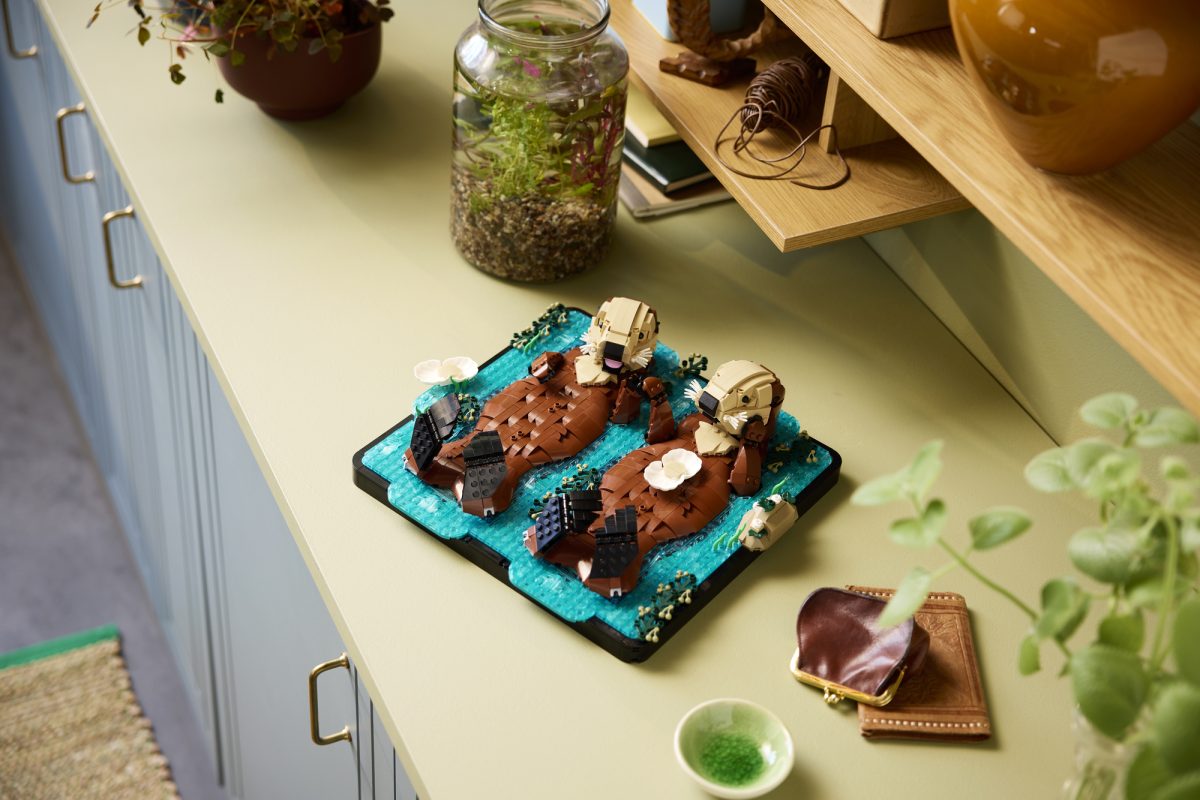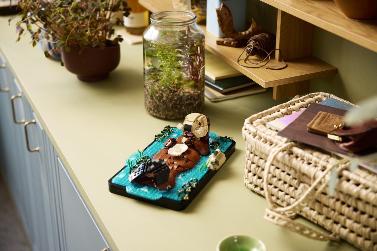 Das 1,234-teilige Modell zeigt den Otter halb unter Wasser auf einem schwarzen Sockel und enthält verschiedene Accessoires, die man auf seinem Bauch platzieren kann, während er schwimmt. Zur Auswahl stehen eine niedliche Welpenfigur oder eine Muschel, aus der der Otter fressen kann – so lässt sich die Darstellung abwechslungsreich gestalten.